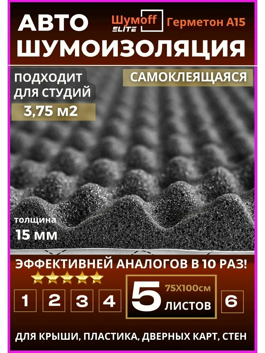 Акустический поролон Шумофф Герметон А15 - 3 листа. Шумоизоляция для автомобиля Шумоff 15 мм, шумка в авто, шумоизоляция дверей, дверных карт, крыши, потолка, пола, шумка в машину, звукоизоляция авто, акустика в машину