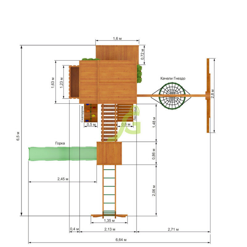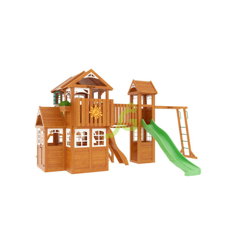 | Комплектация | - закрытый двухуровневый игровой домик с дверью и деревянной крышей; - увеличенный первый этаж с доп. двускатной крышей; - дополнительный двухуровневый домик с деревянной крышей; - балкон; - деревянное кашпо; - волновая горка S-line 3 м; - рукоход; - подвесной мост; - деревянная лестница; - скалодром; - канат; - качельный модуль; - качели-гнездо 100 см; - доска для игры в “Крестики-нолики”; - пластиковое окошко; - комплект фурнитуры; - руководство по сборке. |