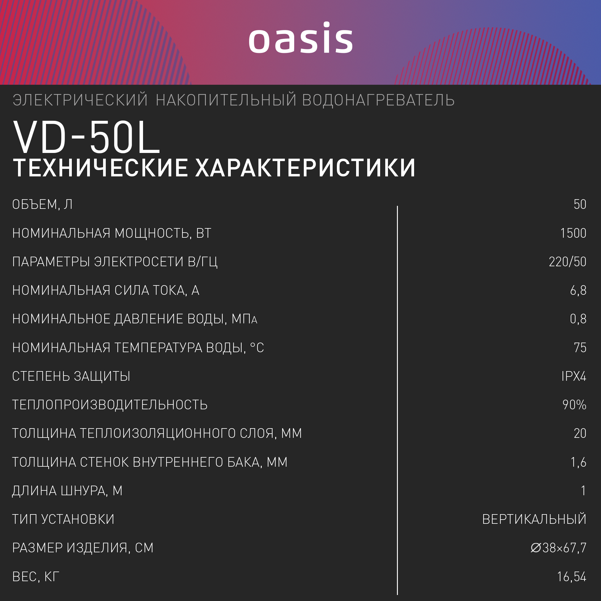 Водонагреватель накопительный электрический Oasis VD-50L, бойлер для воды, 1500 Вт, 50 литров интересное: