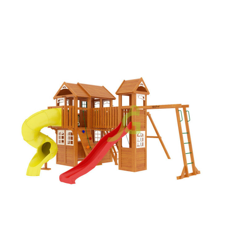 | Комплектация | - закрытый двухуровневый игровой домик с дверью, деревянной крышей; - балкон; -увеличенный первый этаж с доп. домиком; - отдельно стоящий дополнительный двухуровневый домик с деревянной крышей; - деревянное кашпо; - пластиковое окошко; - волновая горка S-line 3 м; - горка труба с высотой 1,5 м; - рукоход; - подвесной мостик; - деревянная лестница; - скалодром; - канат; - качельный модуль; - качели-гнездо 100 см; - доска для игры в “Крестики-нолики”; - комплект фурнитуры; - руководство по сборке. |