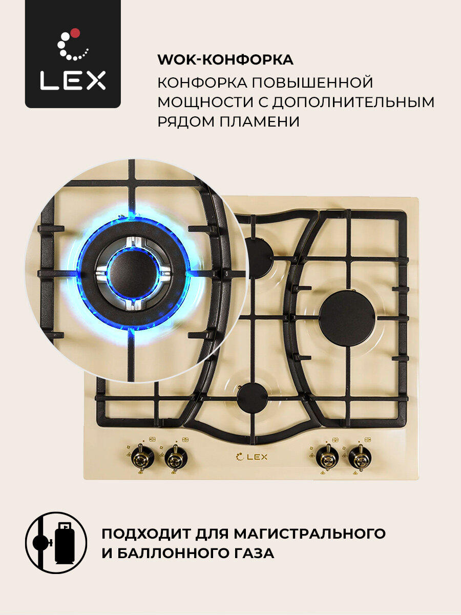Газовая варочная панель LEX GVE 643 C IV, газ-контроль , электроподжиг, конфорка WOK,