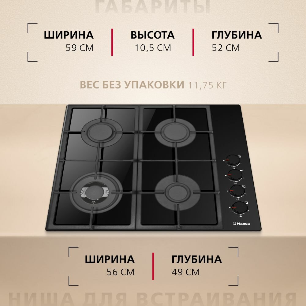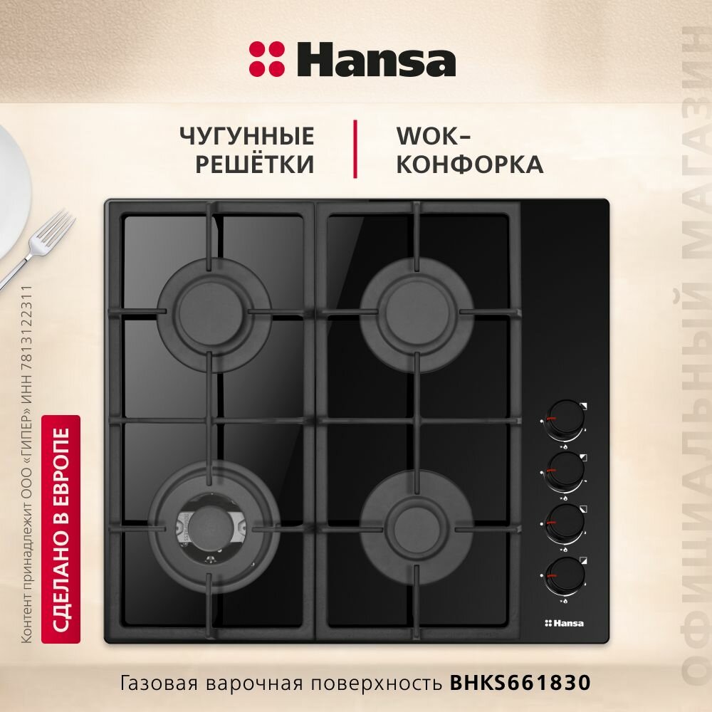 Газовая варочная поверхность Hansa BHKS661830, черный, закаленное стекло, 59 см, автоподжиг, газ-контроль, WOK интересное: