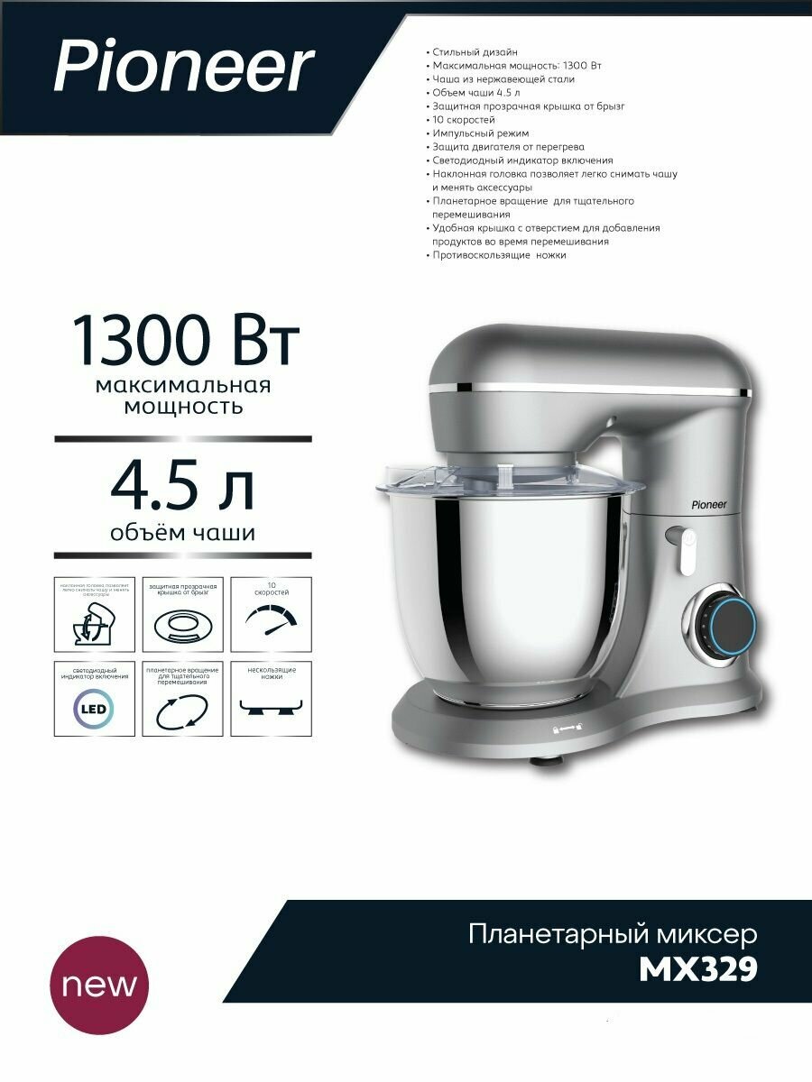 Миксер планетарный Pioneer MX329 с чашей из нержавеющей стали 4,5 л, 10 скоростей, 3 насадки, импульсный режим, защита двигателя от перегрева, 1300 Вт интересное: