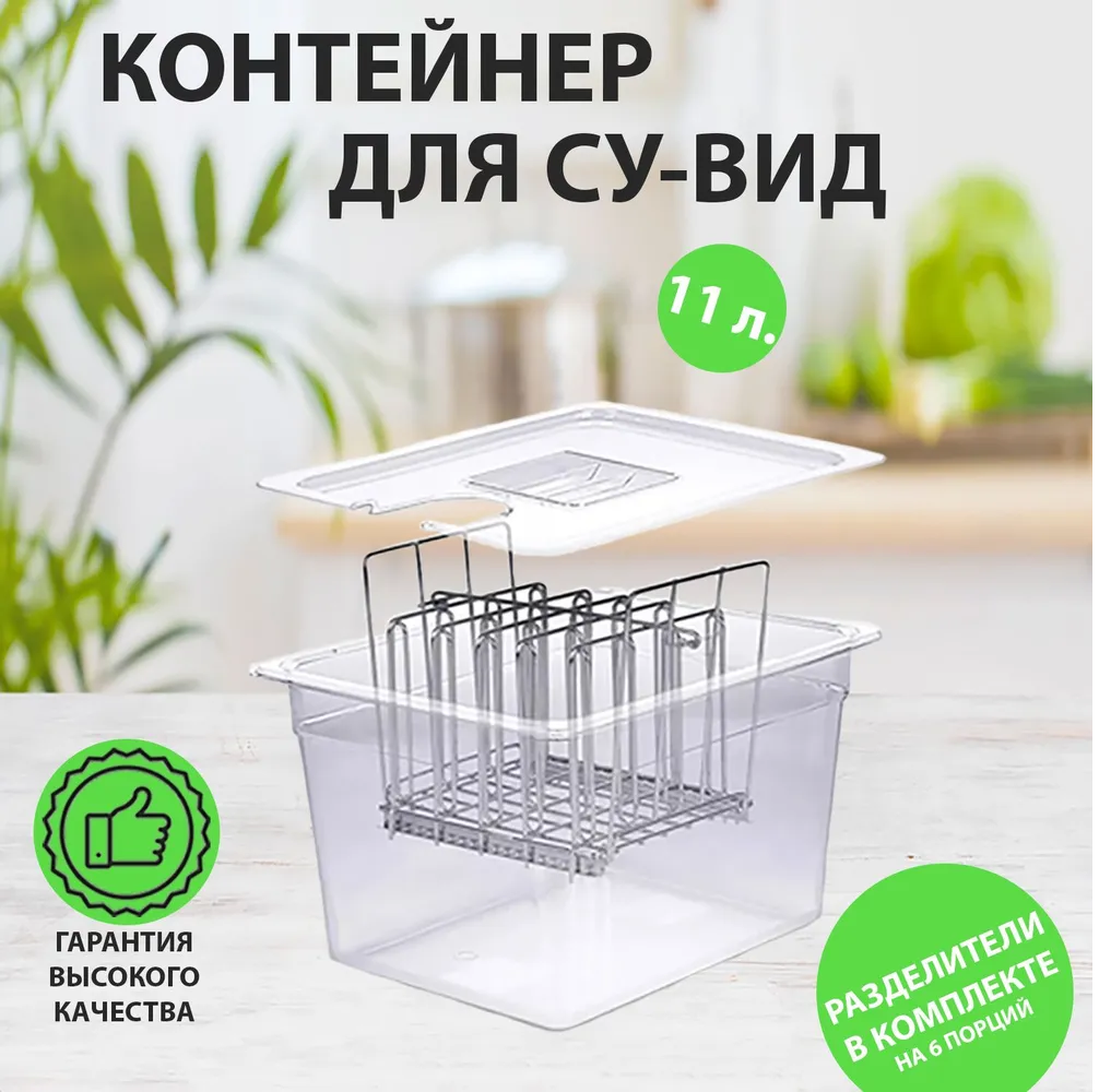 | Подробная комплектация | Термостат погружной Су-вид, Пластиковый контейнер для су-вид с крышкой объемом 11 литров и металлическими разделителя для продуктов, Вакуумный упаковщик для хранения продуктов. |