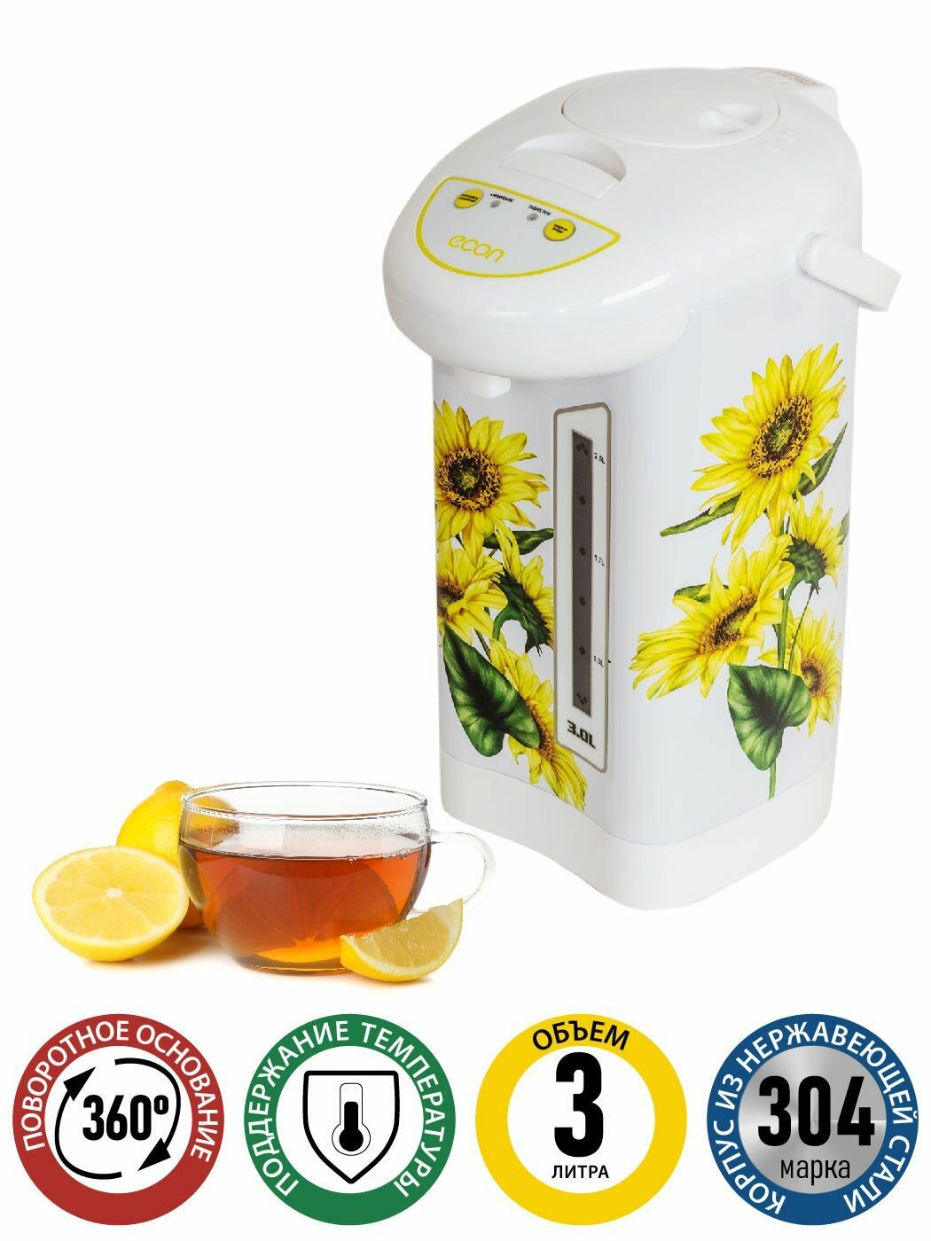 Купить Термопот ECON ECO-302TP объем 3 л, с электронным управлением, функция повторного кипячения, поддержание температуры, 2 способа подачи воды, 600 Вт