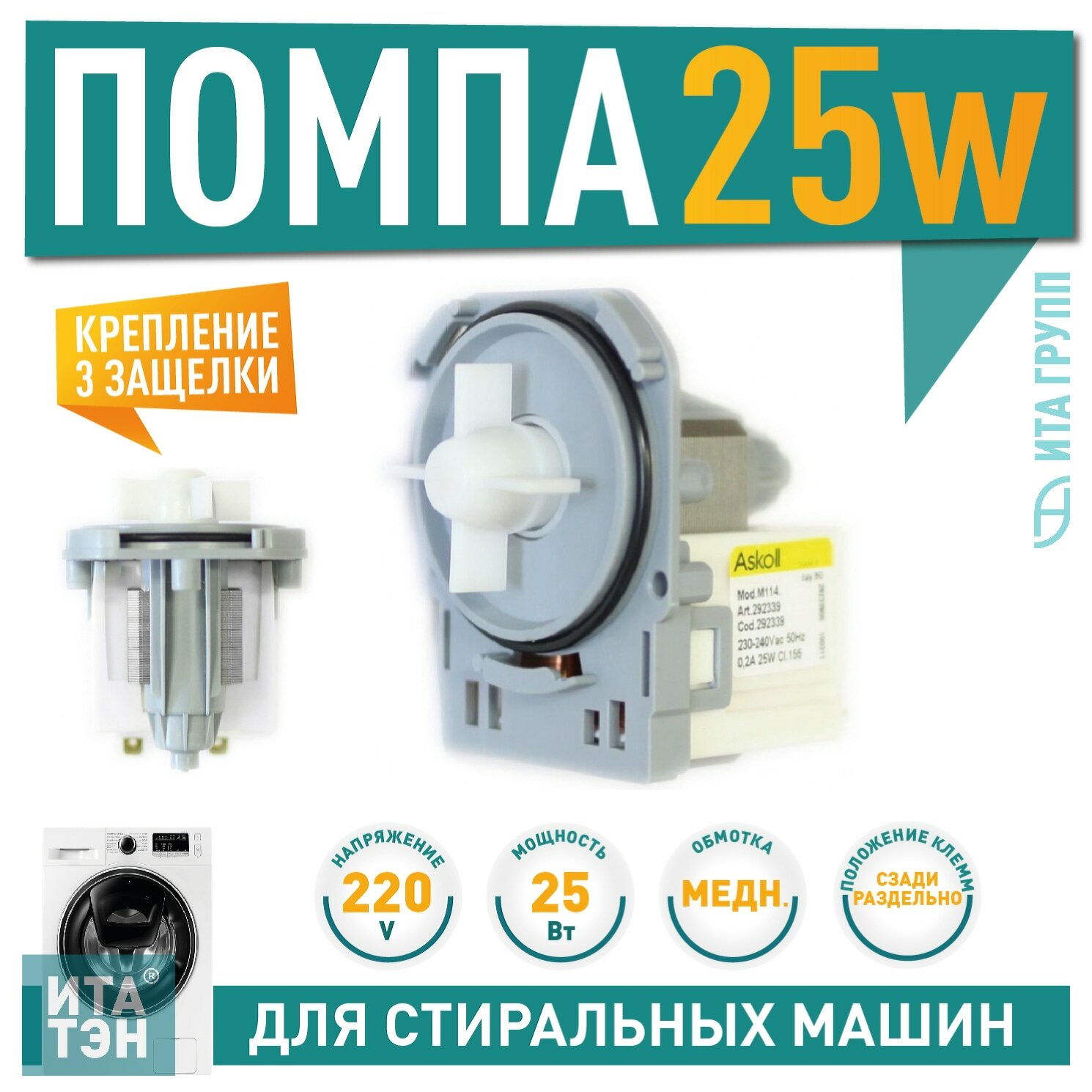 Сливной насос (помпа) для стиральной машины Electrolux, Zanussi, AEG, Askoll M114, 25W, 3 защёлки, Р004 интересное: