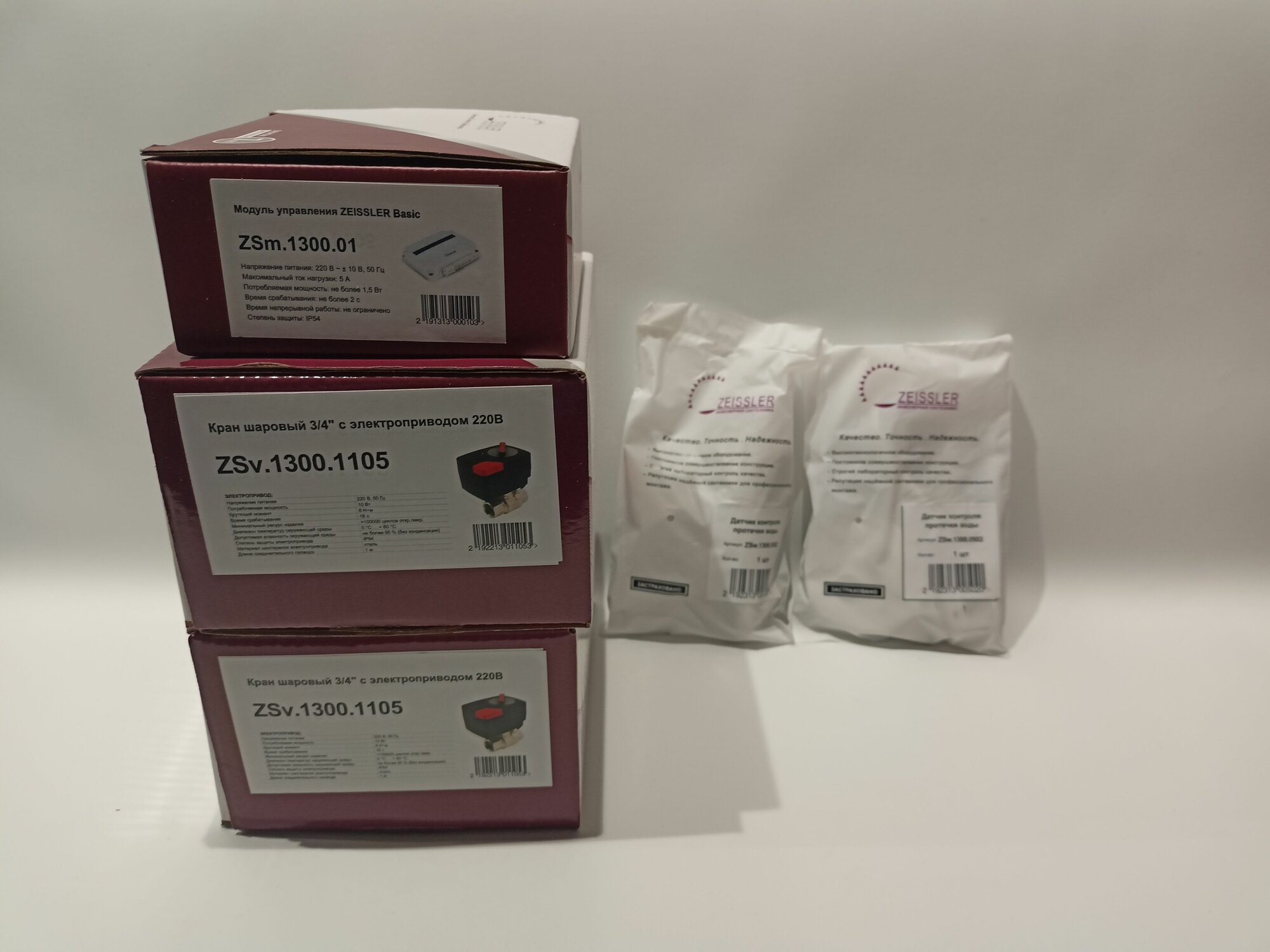| Подробная комплектация | - Кран с электроприводом 3/4'' - 2 шт.; - Блок управления - 1 шт.; - Проводной датчик - 2 шт. - Гарантийный талон и инструкция |
