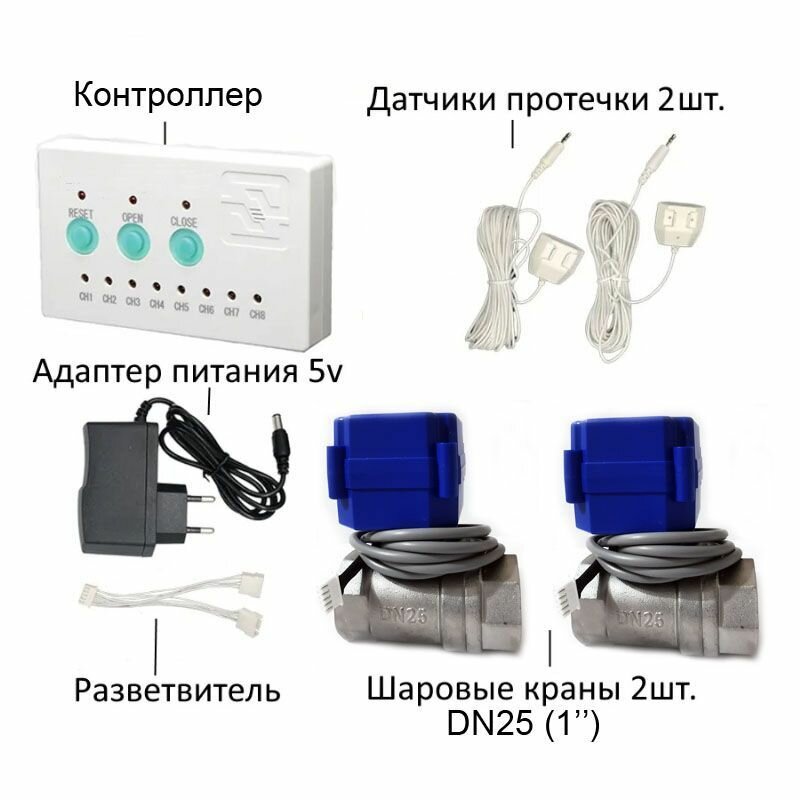 Система защиты от протечек воды (2 крана 1", 2 датчика по 6 метров) Water Leakage Alarm для фильтра Родничок, дома или квартиры. интересное: