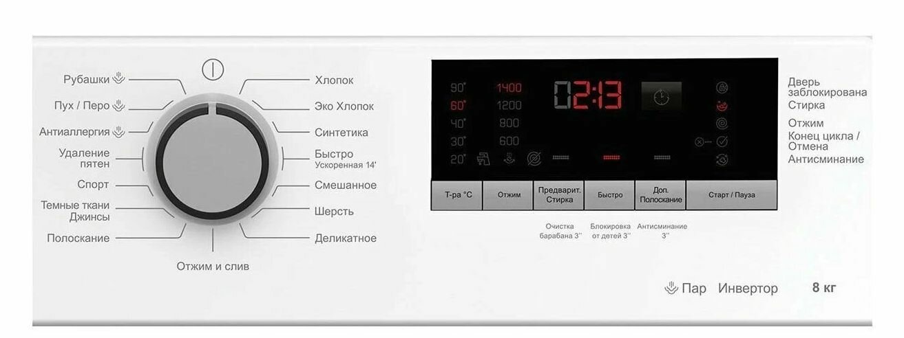 | Программы | быстрая стирка / гипоаллергенная стирка / дополнительное полоскание / отжим / полоскание / предварительная стирка / стирка верхней одежды / стирка деликатных тканей / стирка детских вещей / стирка джинсов / стирка паром / стирка пуховых вещей / стирка синтетики / стирка смешанных тканей / стирка спортивной обуви / стирка спортивной одежды / стирка хлопка / стирка цветных вещей / стирка черных вещей / стирка шелка / стирка шерсти / удаление пятен / экономичная программа |