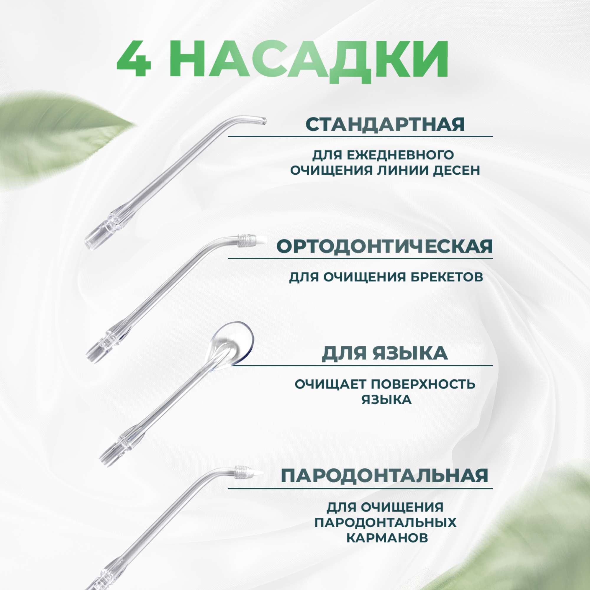| Насадки | для струйной чистки / для чистки языка / ортодонтическая (для брекетов) / пародонтологическая (для десен) |