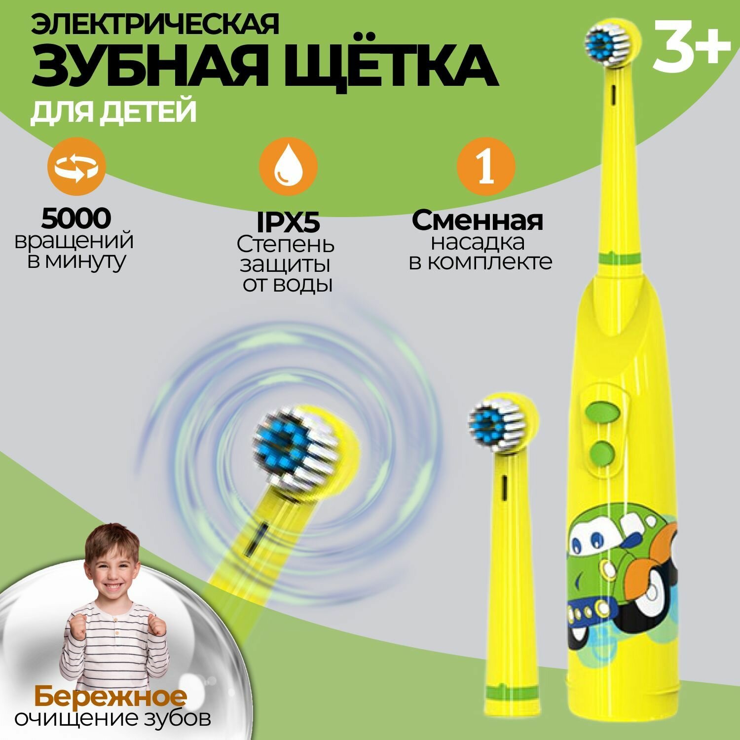 Электрическая зубная щетка детская Biksi с 2 насадками, от 2 батареек АА, желтый интересное: