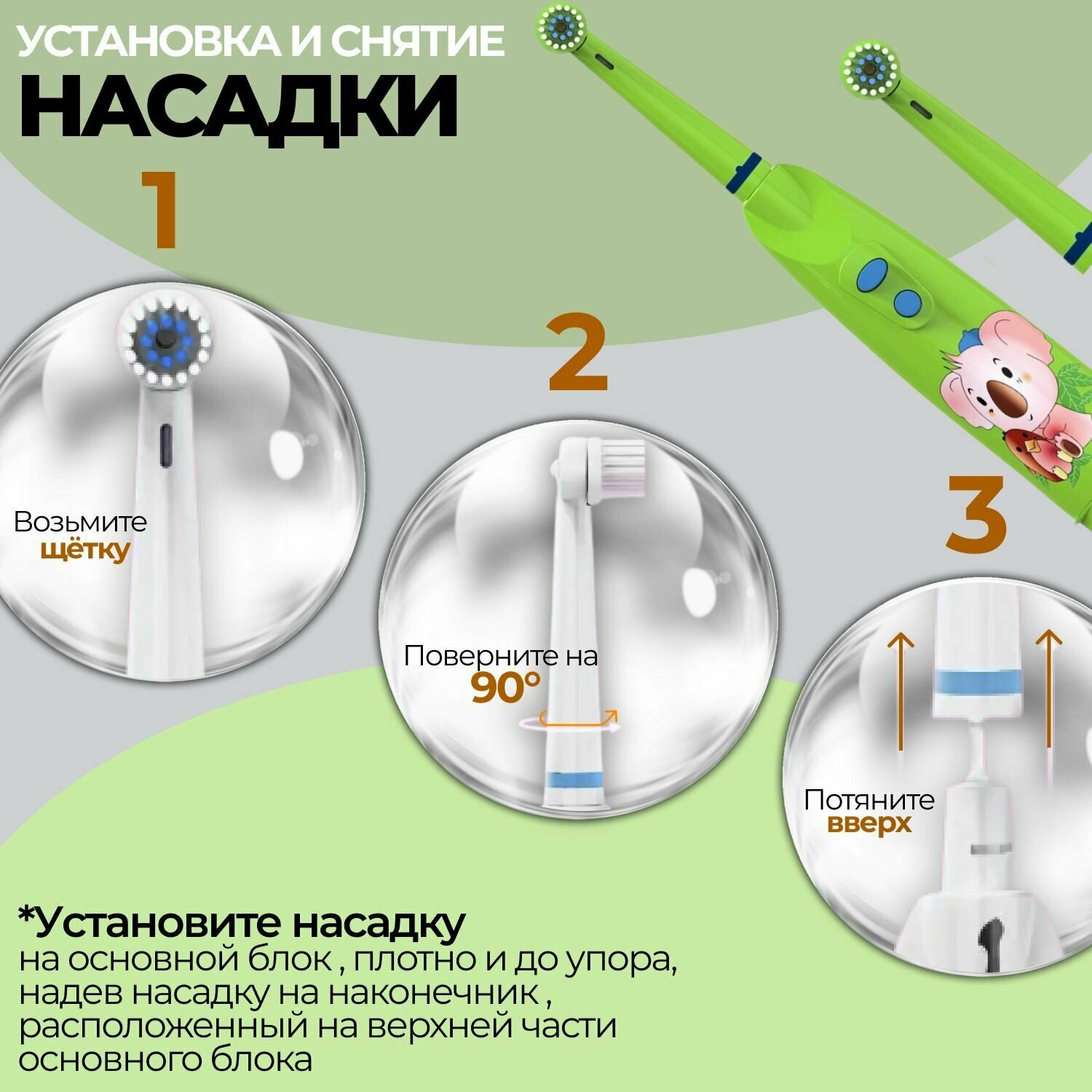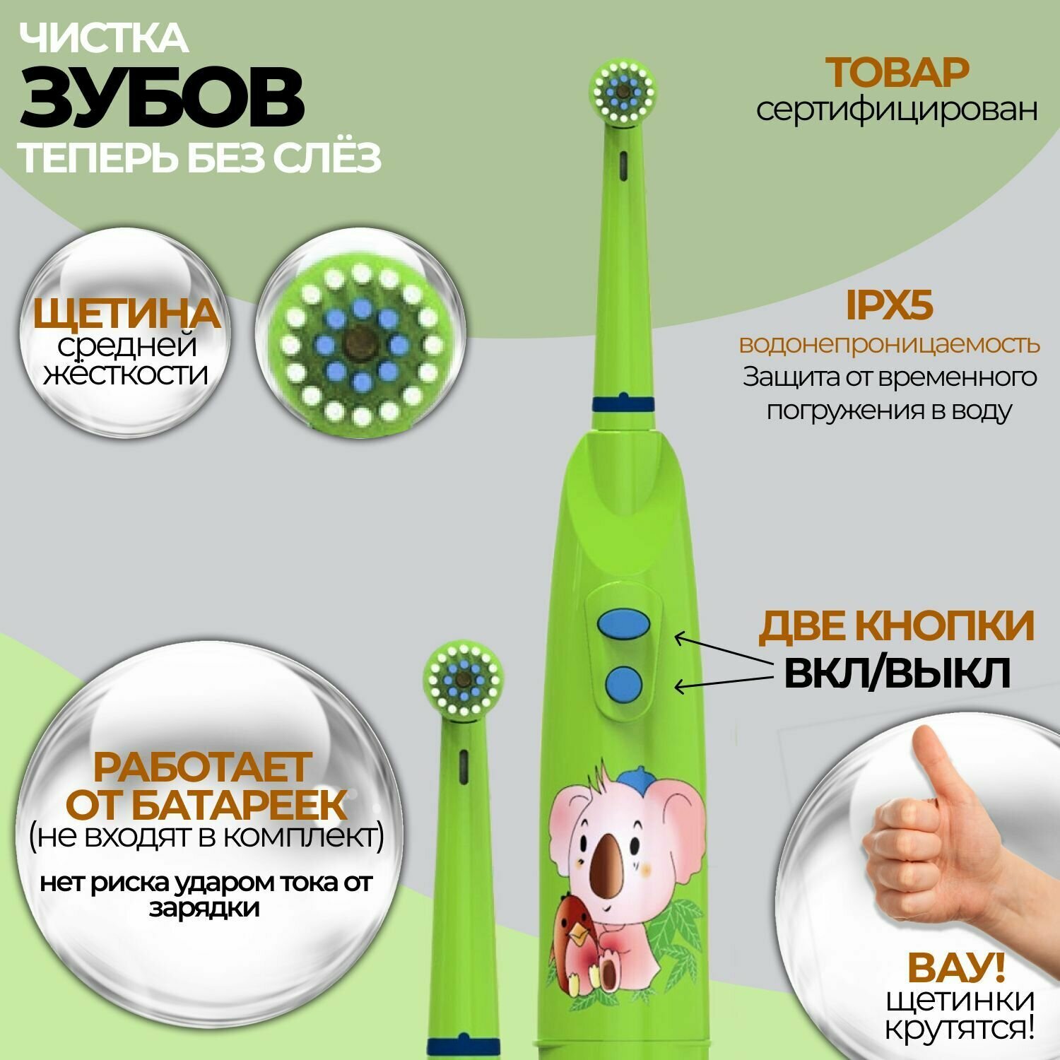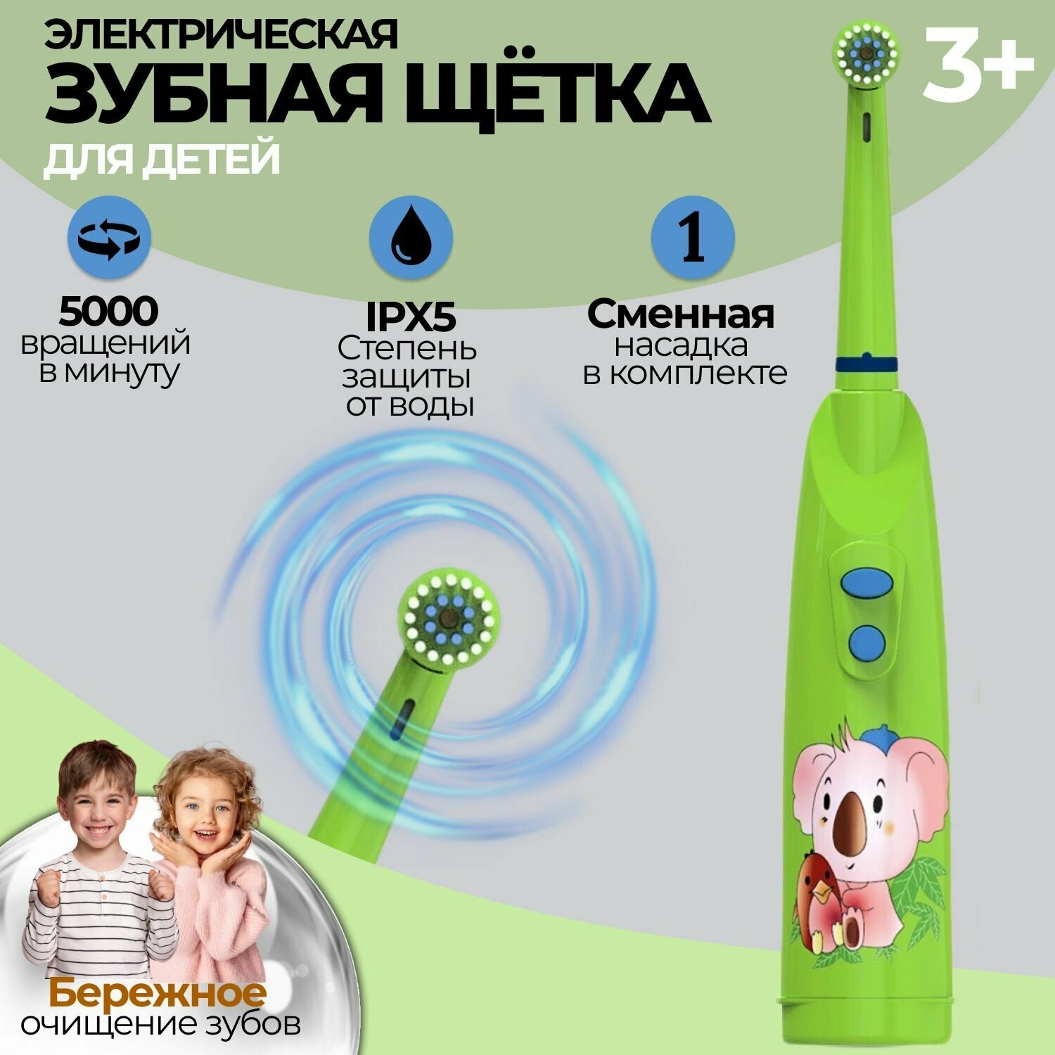 Электрическая зубная щетка детская Biksi, с 2 насадками, от 2 батареек АА, зеленый интересное: