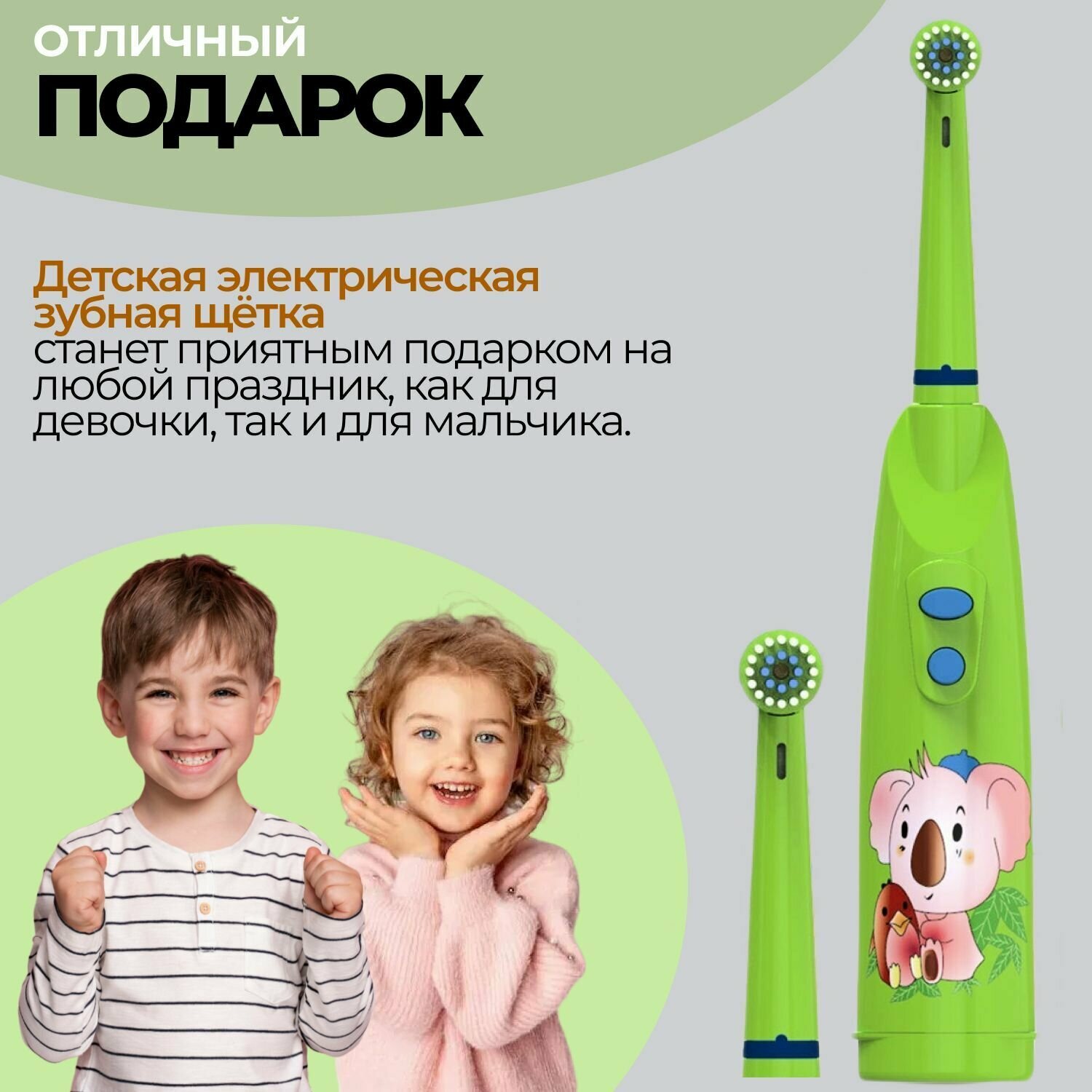 Купить Электрическая зубная щетка детская Biksi, с 2 насадками, от 2 батареек АА, зеленый
