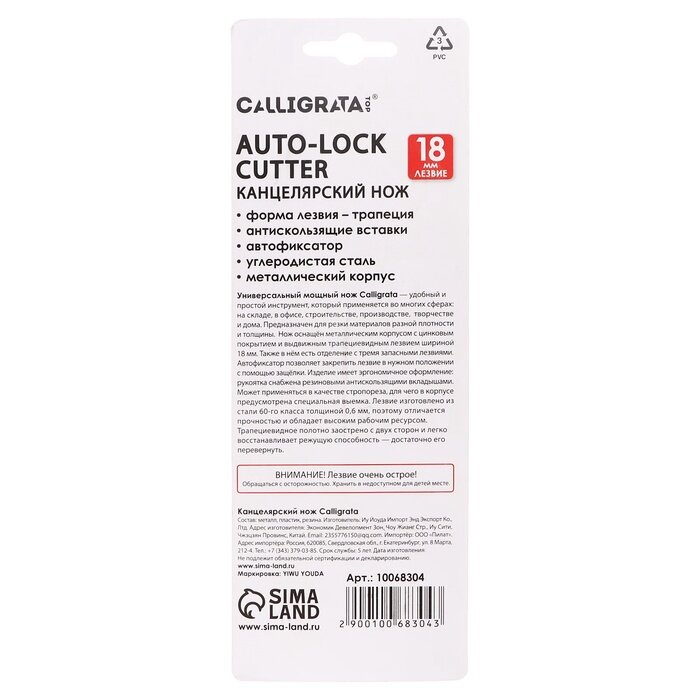 Нож канцелярский Calligrata TOP, 18 мм, пластиковый, с фиксатором, прорезиненный, 1 шт
