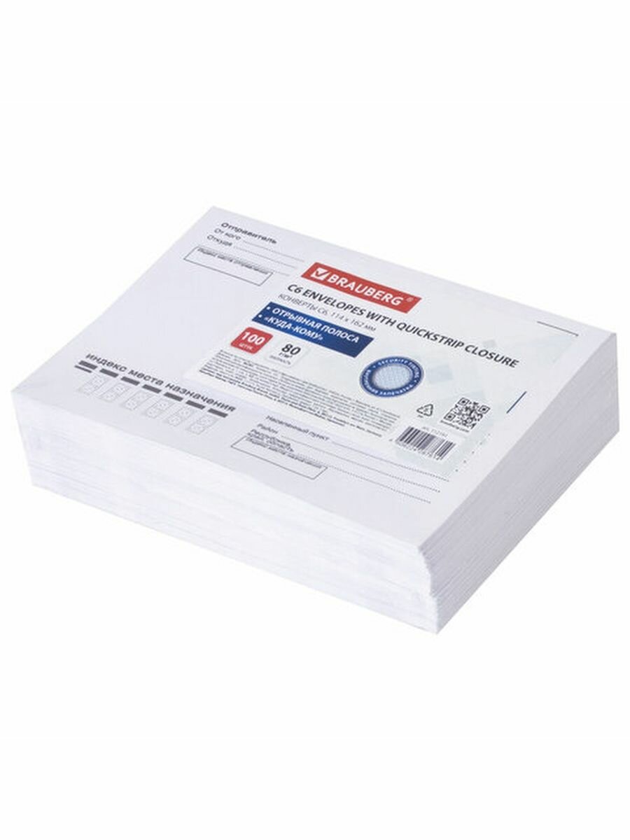 Конверт почтовый C6 Brauberg (114x162мм, 80г, отрывная лента, печать "Куда-Кому") белый, 100шт, 5 уп. (С6НПРс(BRAUB)