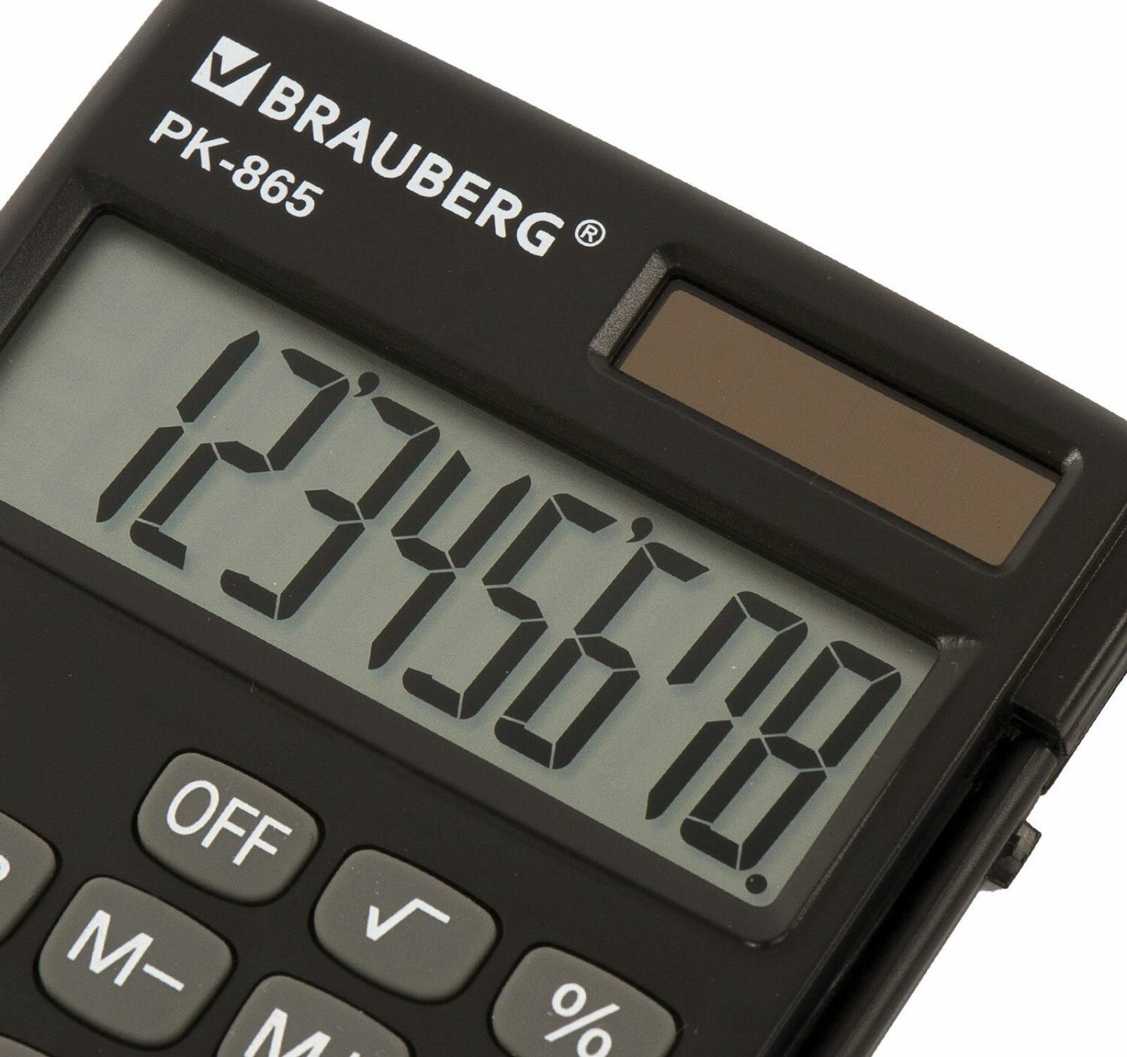 Купить Калькулятор карманный BRAUBERG PK-865-BK (120x75 мм), 8 разрядов, двойное питание, черный, 250524