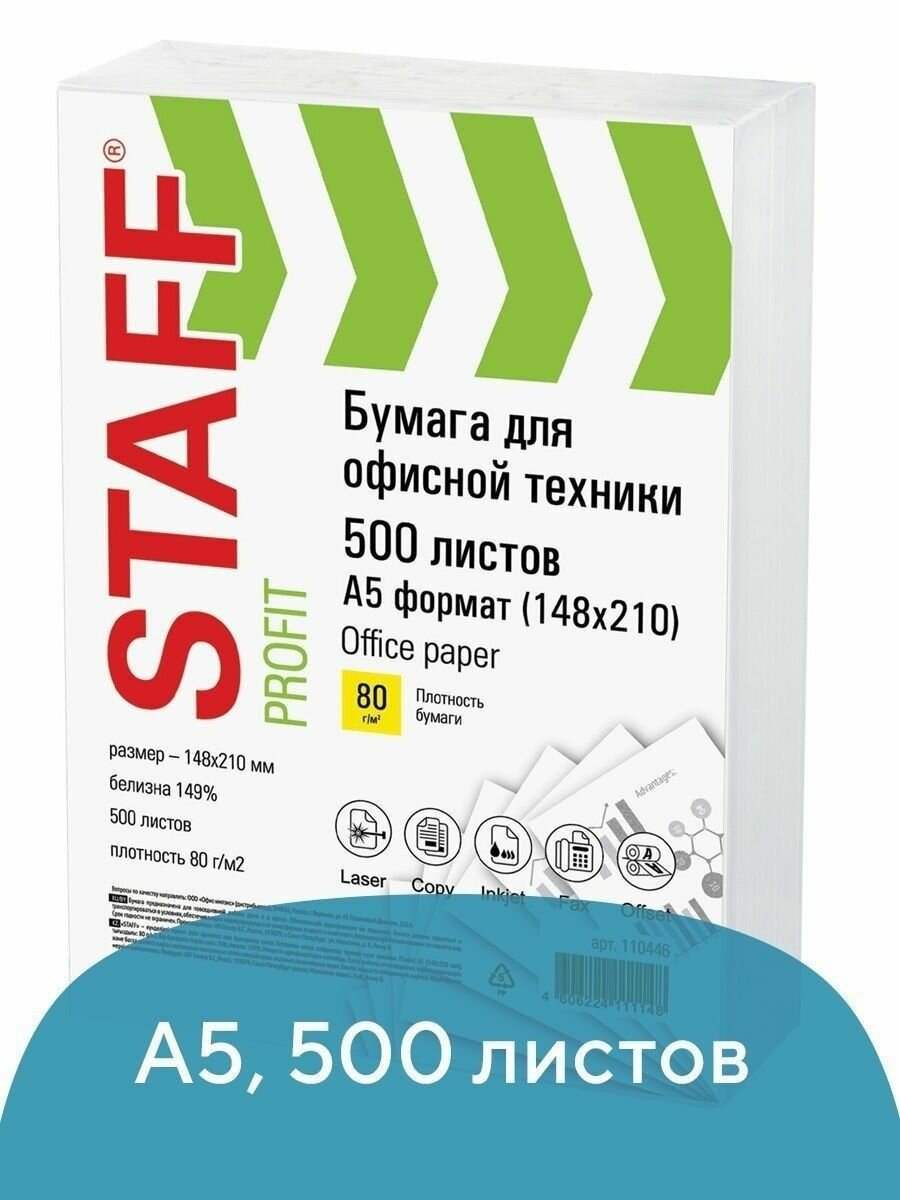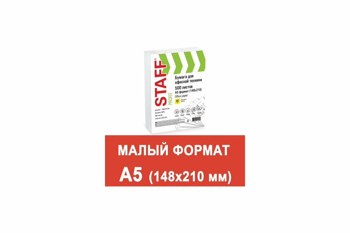 Бумага офисная малого формата (148х210) А5, 80 г/м2, 500 л, марка С, STAFF "Profit", 149% (CIE), 110446