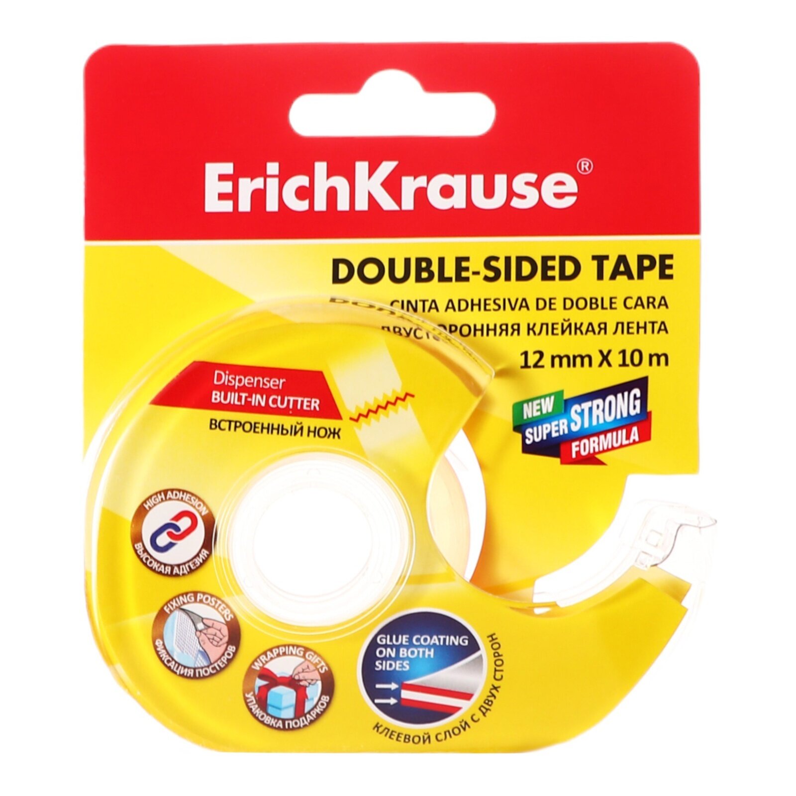 Купить Двусторонняя клейкая лента ErichKrause, прозрачная, 12ммх10м, в диспенсере