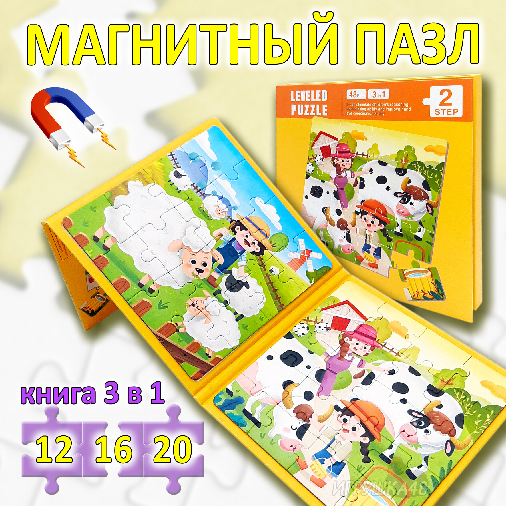 Купить Магнитный пазл для малышей 3 в 1 / Пазл на магнитах игра в дорогу / Набор пазлов разного уровня сложности, 18*18*1,5см, 48 деталей, Ферма, жёлтый
