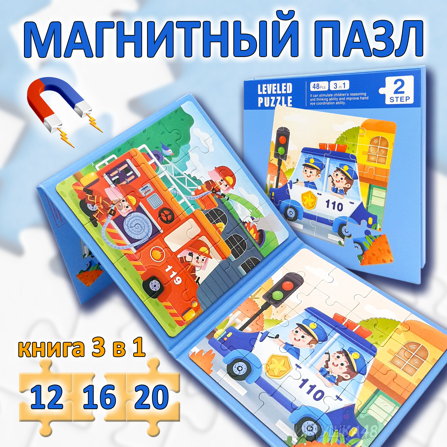 СохранитьМагнитный пазл для малышей 3 в 1 / Пазл на магнитах игра в дорогу / Набор пазлов разного уровня сложности, 18*18*1,5см, 48 деталей, Транспорт, синий интересное: