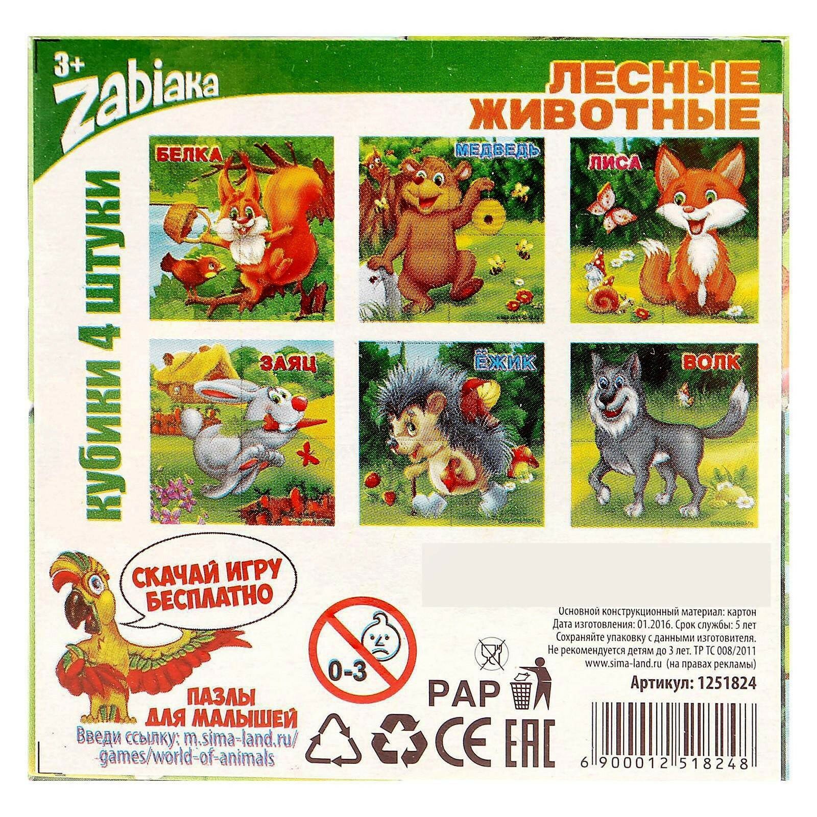 Кубики картонные «Зверята», 4 шт