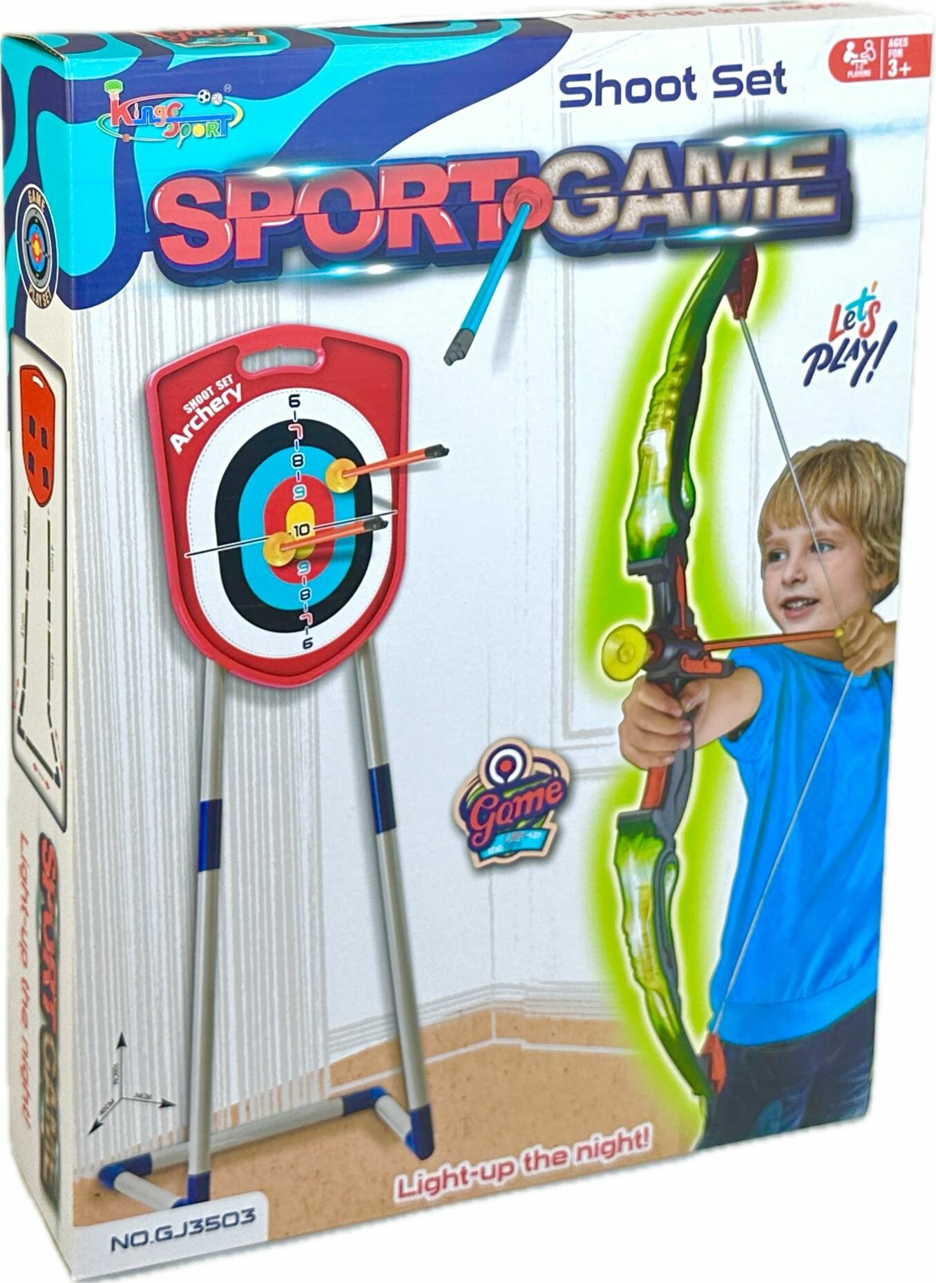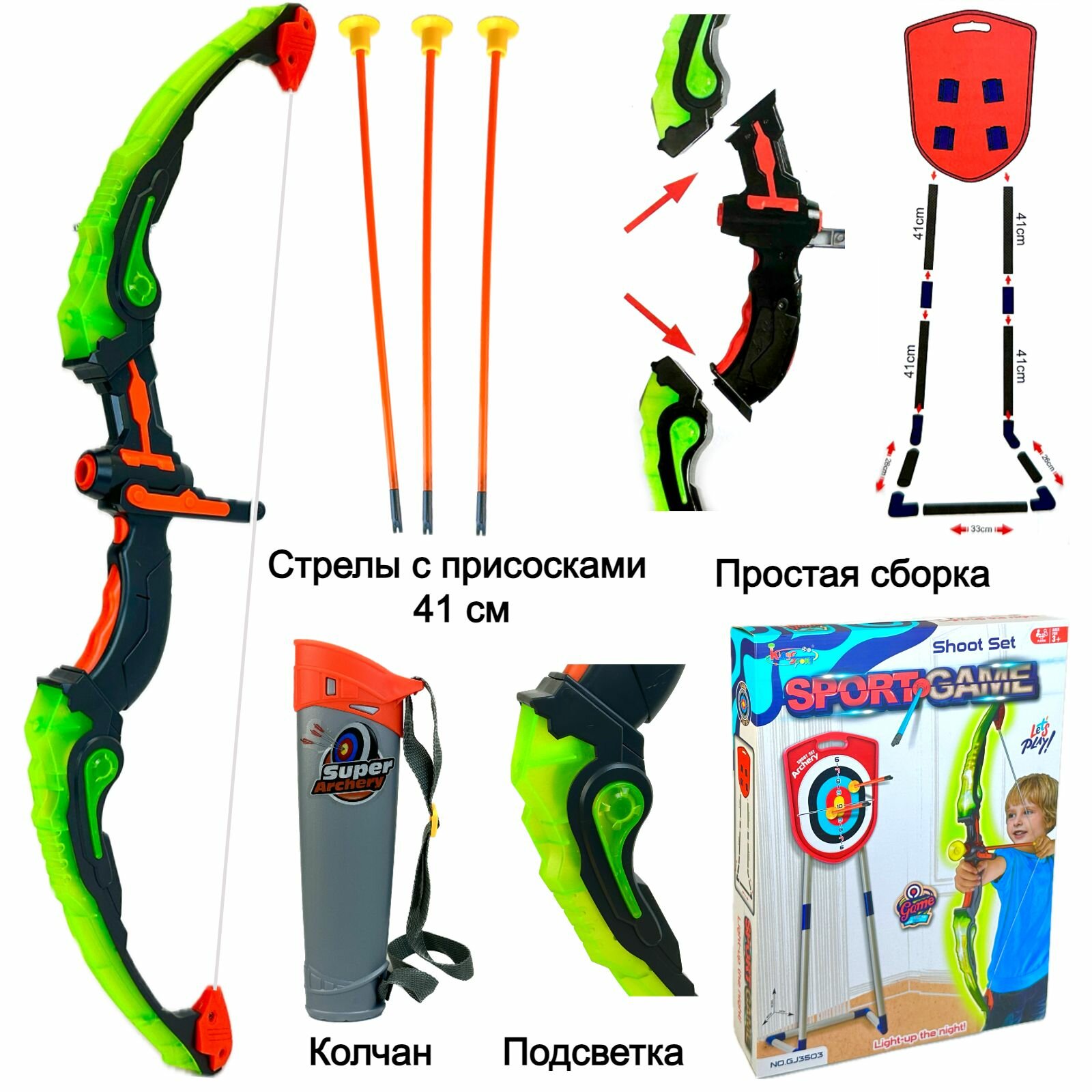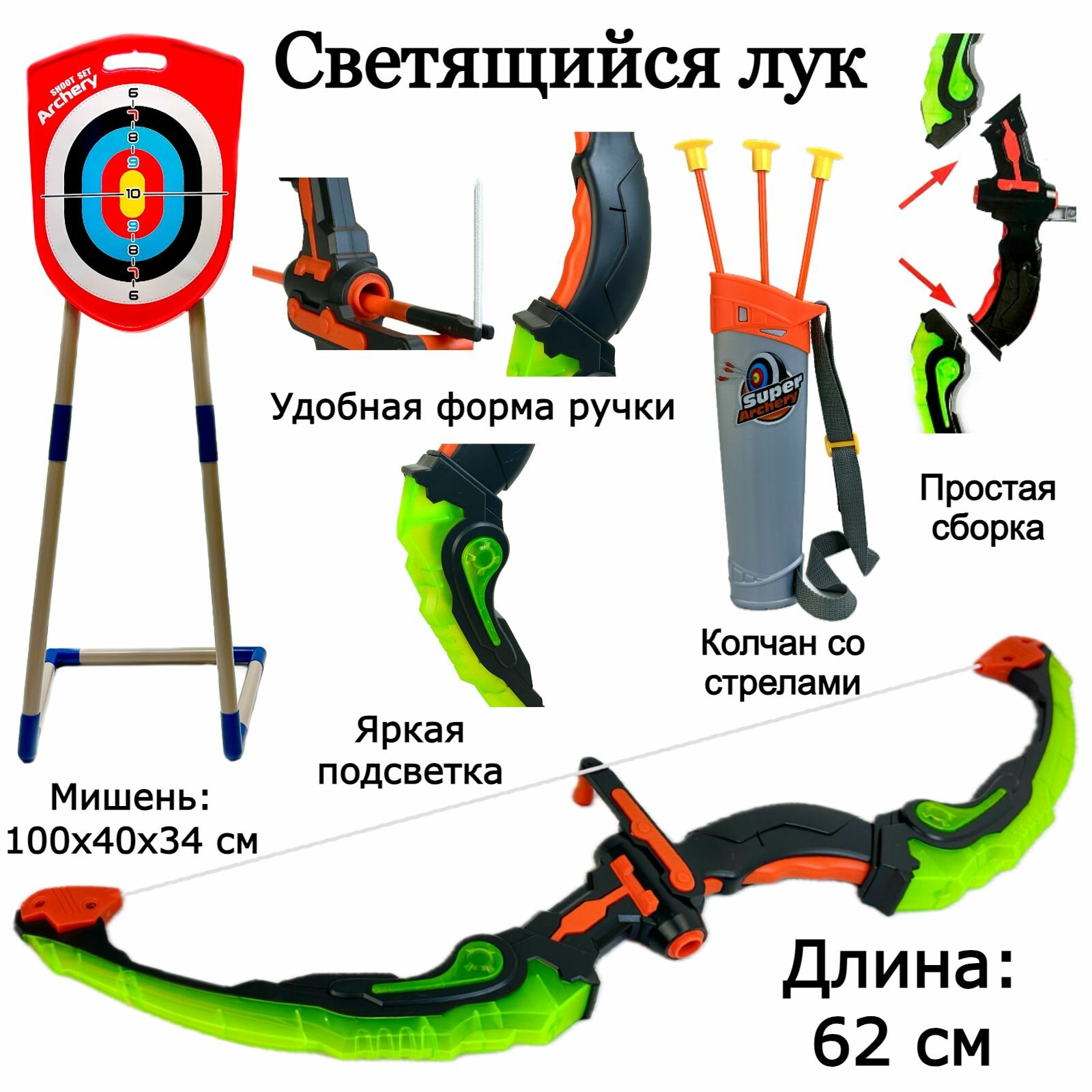 Лук со стрелами на присосках и мишенью в колчане детский игровой набор, светящийся лук 64 см, 102х61х32 см