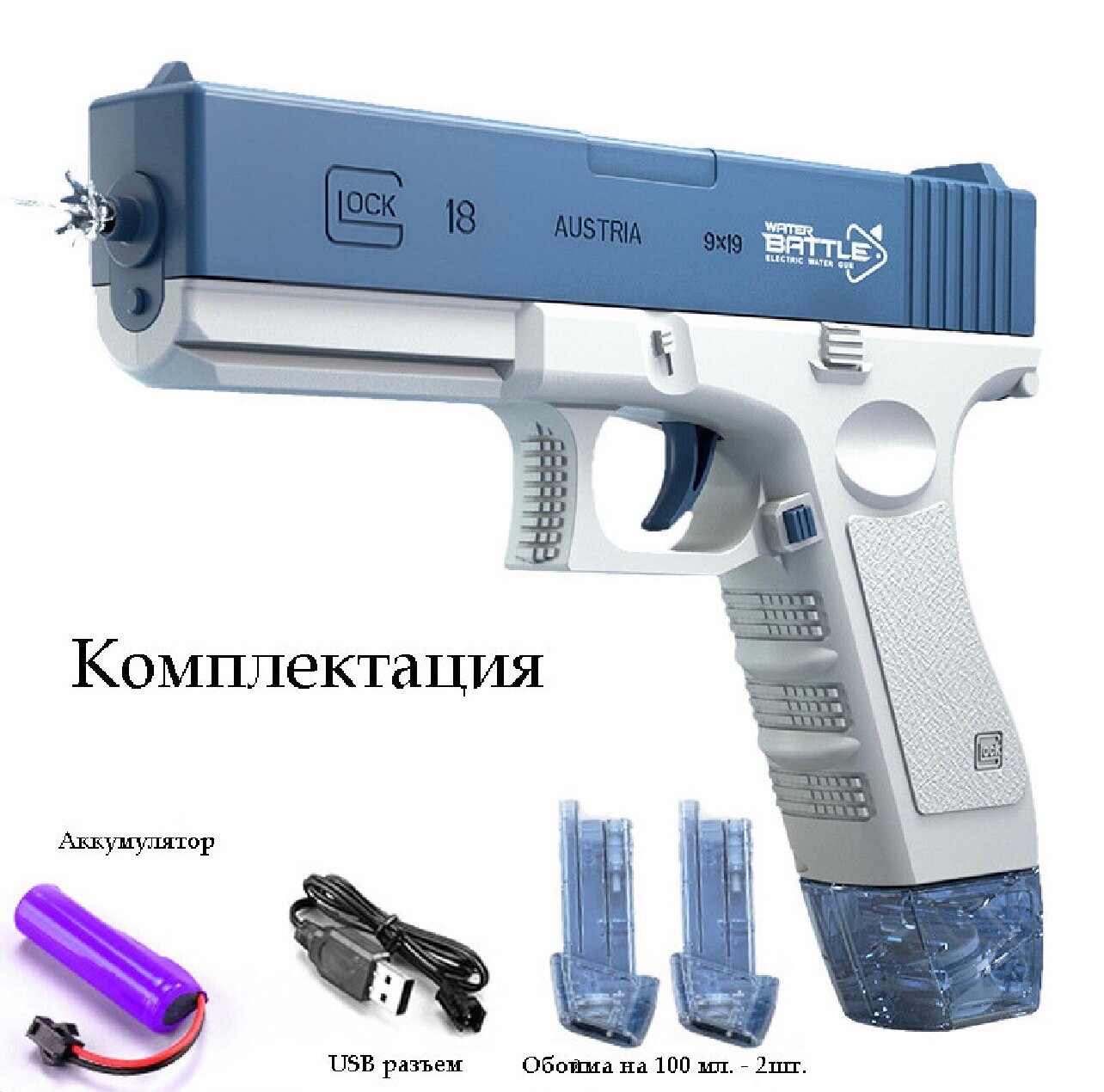 Водный электрический пистолет GLOCK, автоматическая стрельба, дальность 5-8 метров, увеличенная обойма + 1 обычная обойма в комплекте, работа от аккумулятора.