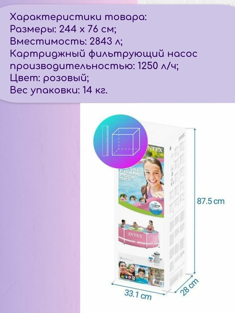 Каркасный бассейн Intex 28292 Pink, розовый 244х76см, 2843л, фильтр-насос 1250л/ч интересное: