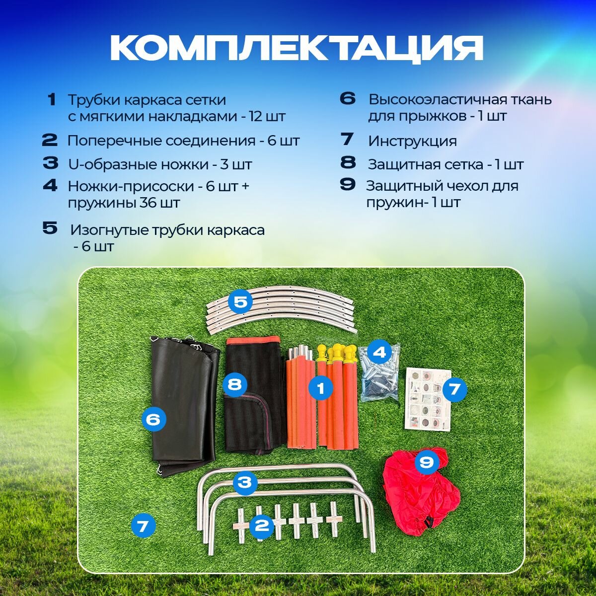 | Состав набора | 1.Трубки каркаса сетки с мягкими накладками - 12 шт 2.Изогнутые трубки каркаса - 6 шт 3.Поперечные соединения - 6 шт 4. U-образные ножки - 3 шт 5.Пружины - 36 шт 6.Ключ для натягивания пружин - 1 шт 7. Ножки-присоски - 6 шт 8.Защитная сетка -1 шт 9.Защитный чехол для пружин - 1 шт 10.Высокоэластичная ткань для прыжков - 1 шт |