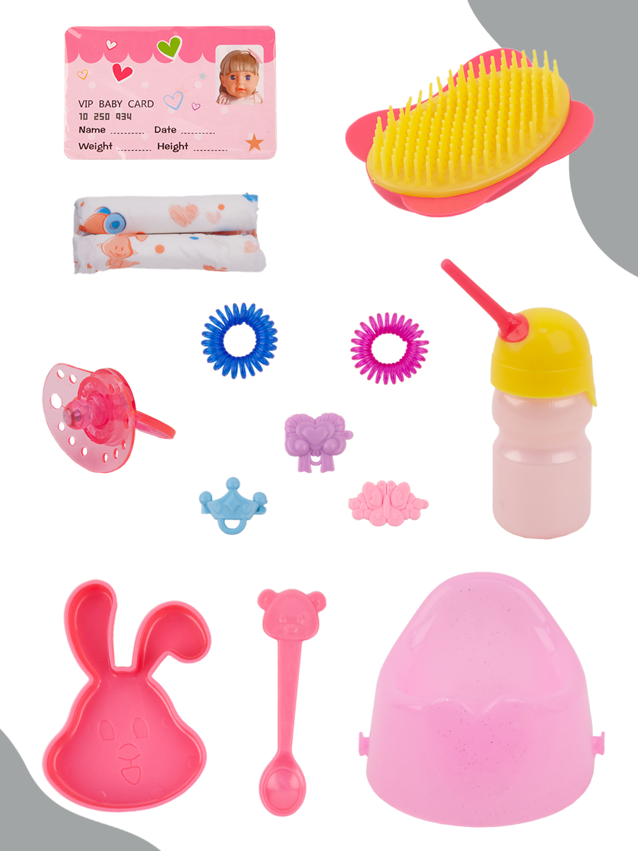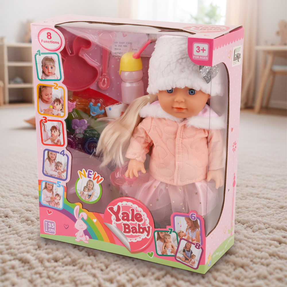 | Комплектация | пупс, свидетельство о рождении, подгузник, бутылочка, пустышка, тарелочка, ложка, горшок |