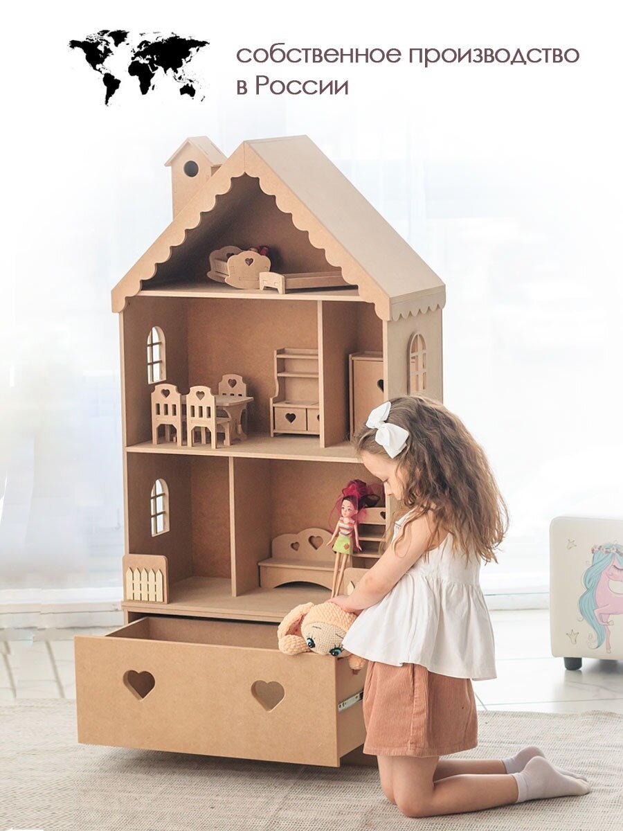 Купить Кукольный домик деревянный с комодом Луиза для кукол до 32 см без окрашивания.