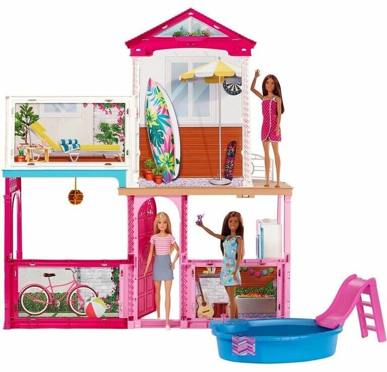 | Дополнительная информация | в доме четыре комнаты - кухня, гостиная, спальня и ванная; у мелких аксессуаров есть крепления, которые позволяют куклам удерживать их в руке; бассейн можно наполнить водой |
