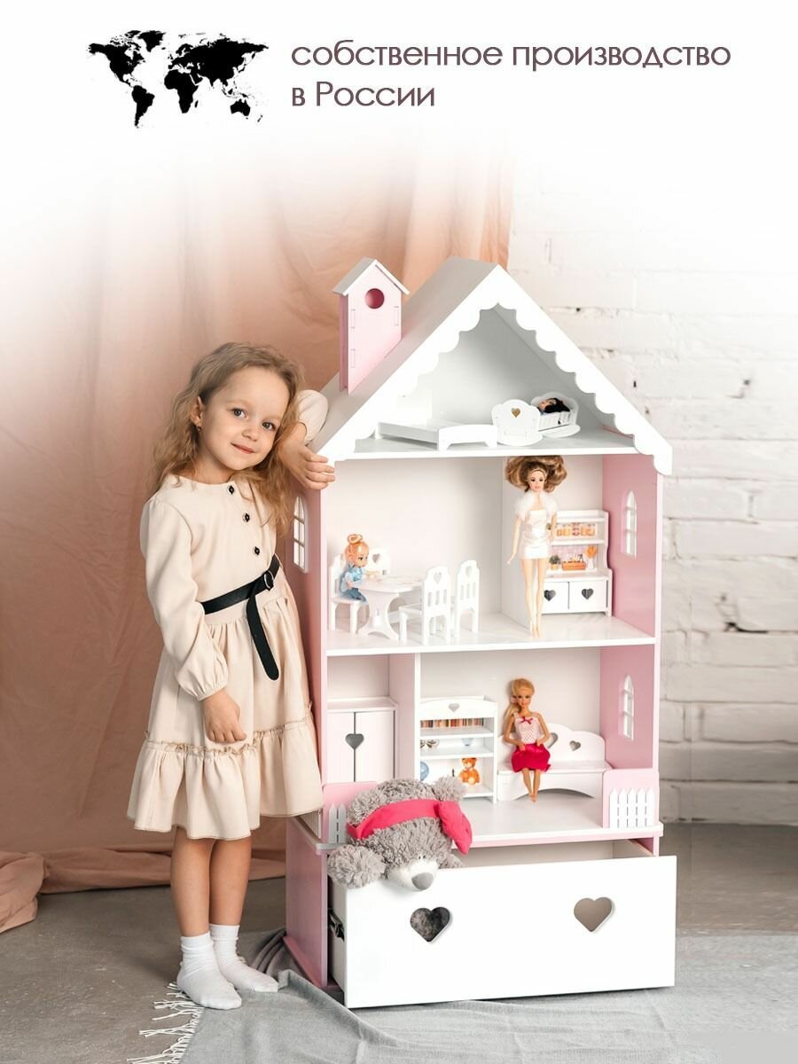 Купить Кукольный домик деревянный с комодом Луиза для кукол до 32 см розово-белый