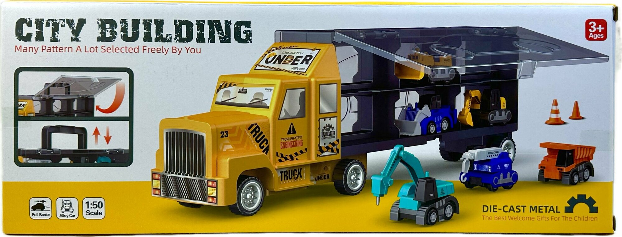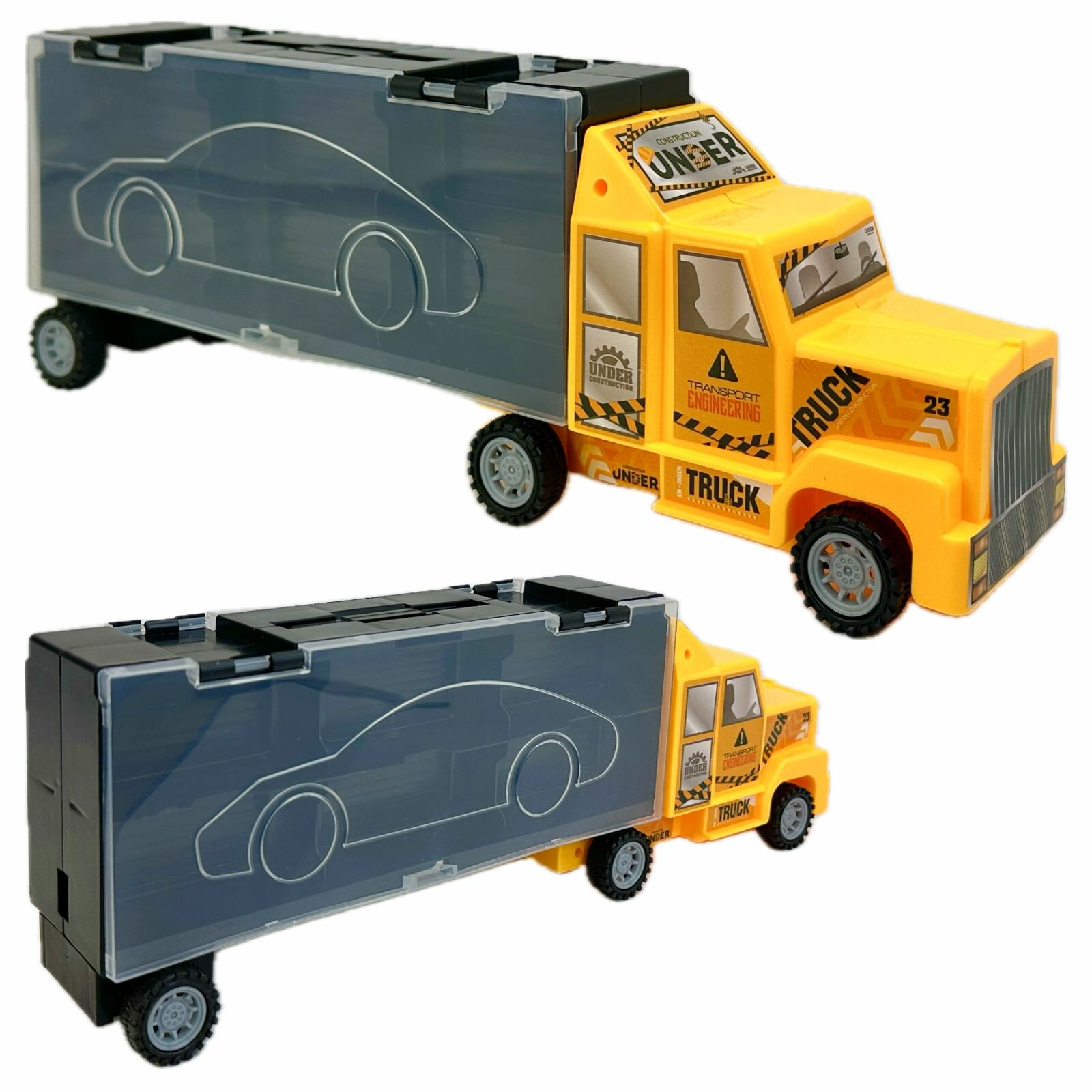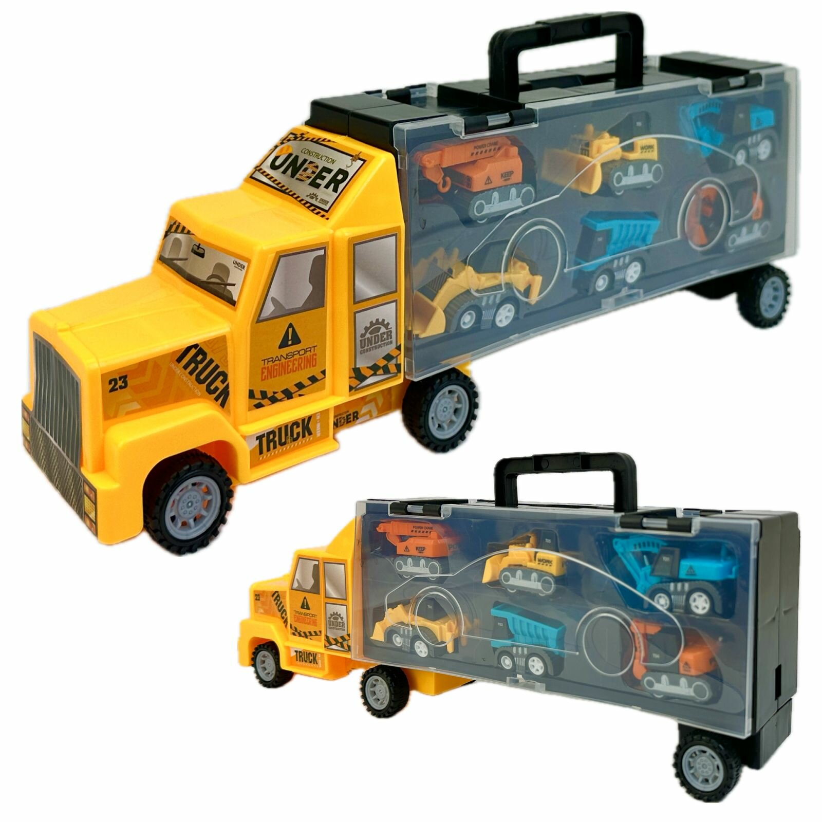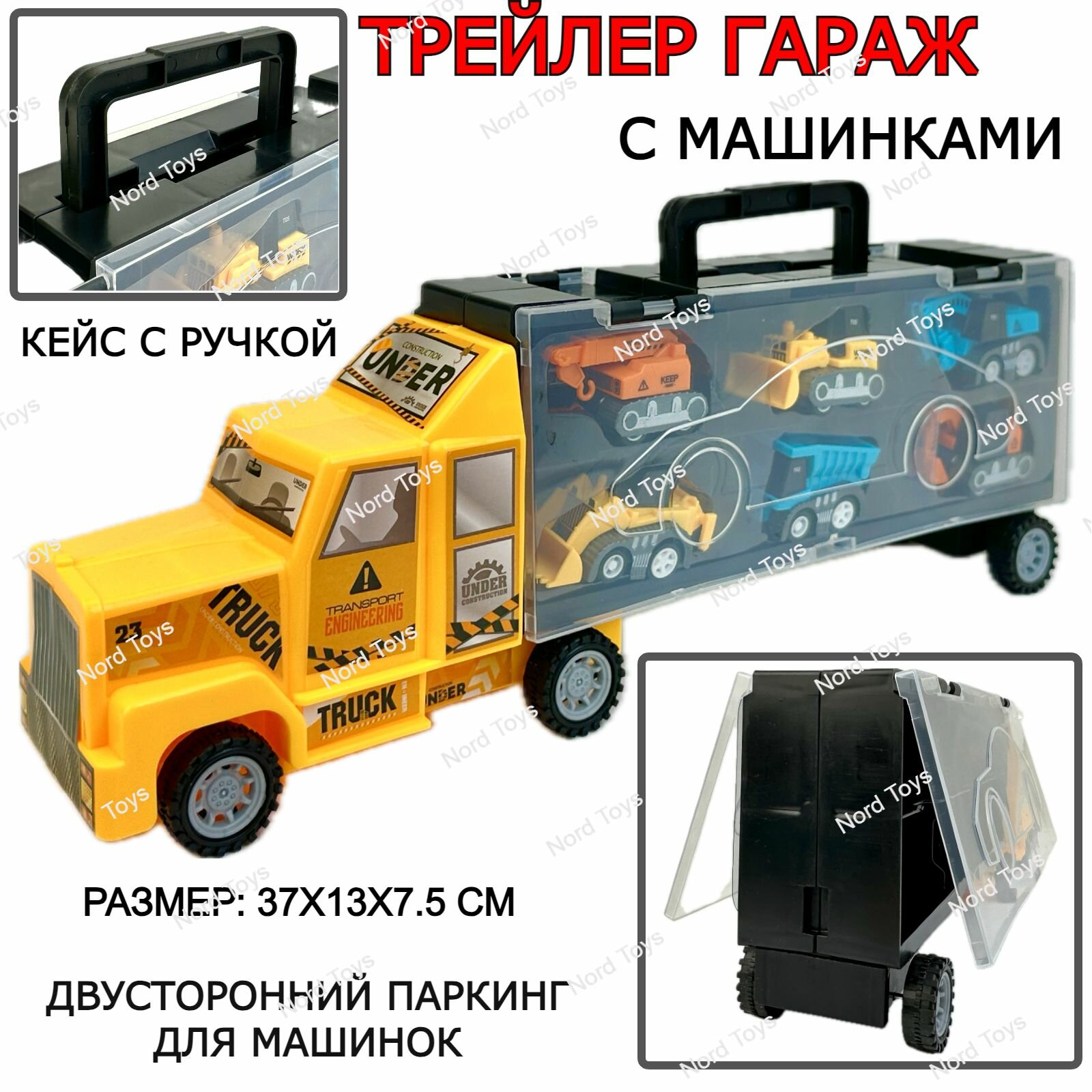 Купить Трейлер-гараж с набором машинок, машина-автовоз (кейс с ручкой), строительная техника, 37х13х7 см