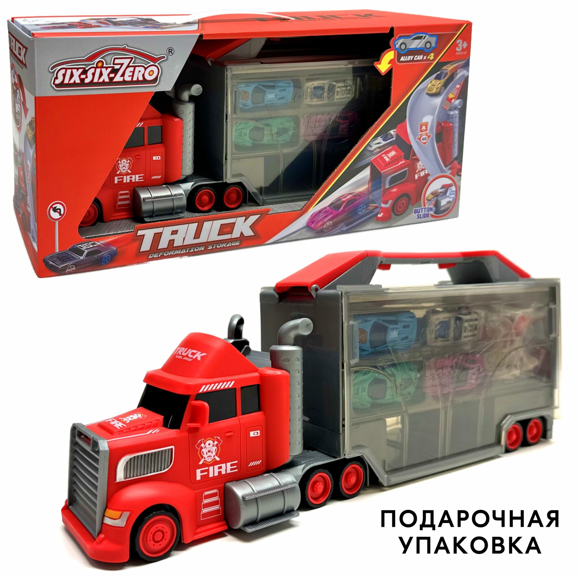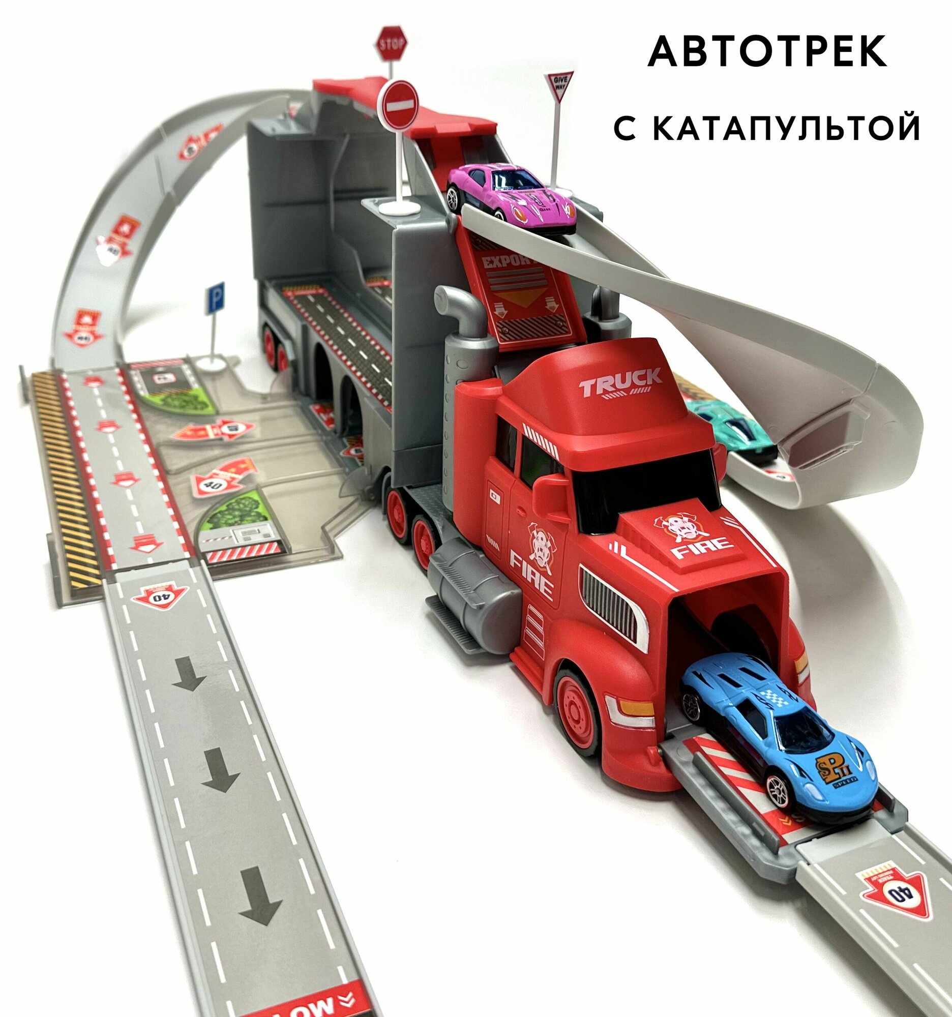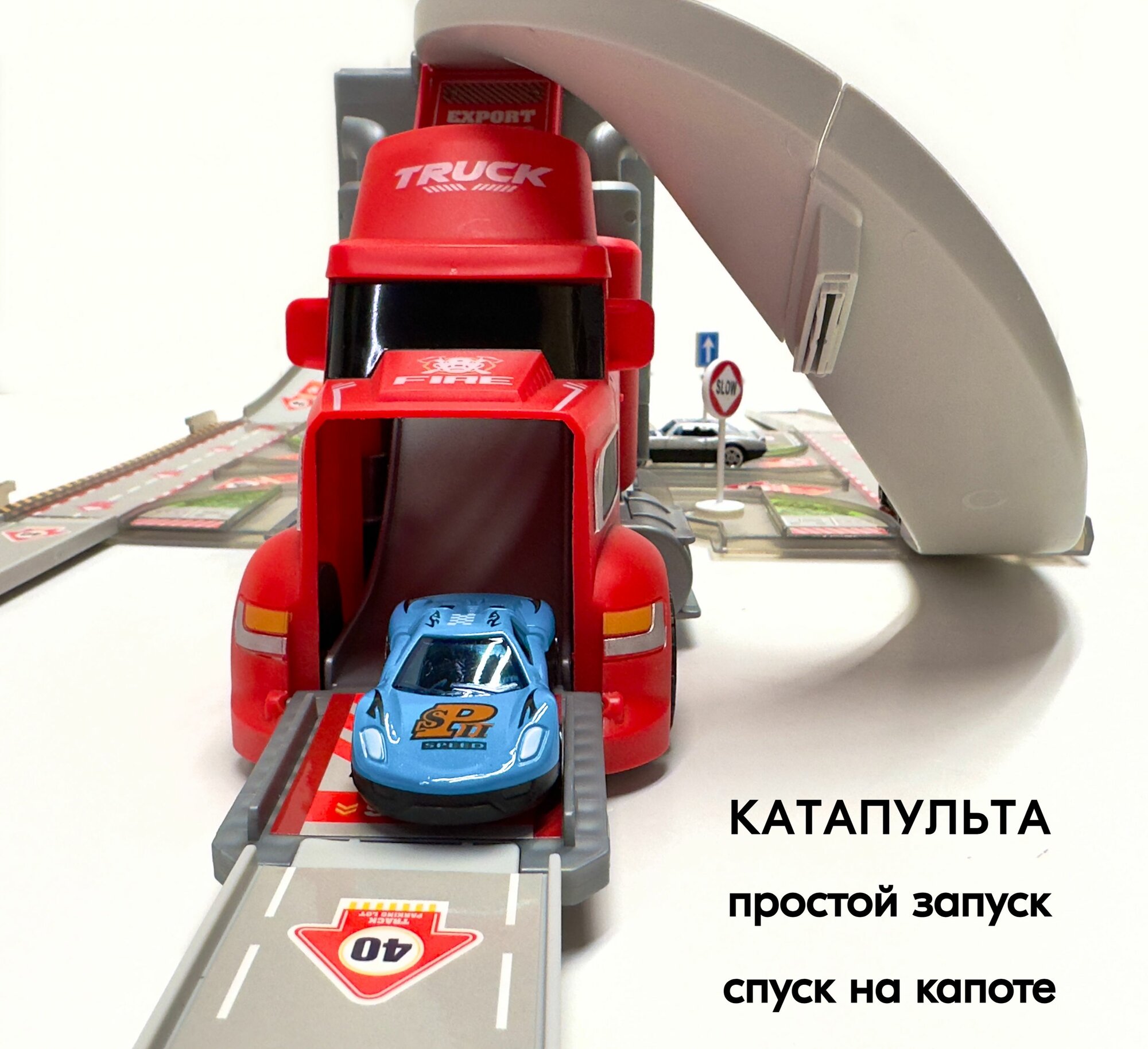 Купить Большой автовоз с металлическими машинками и катапультой, грузовик автотрек, трейлер-гараж, 43х18х10 см