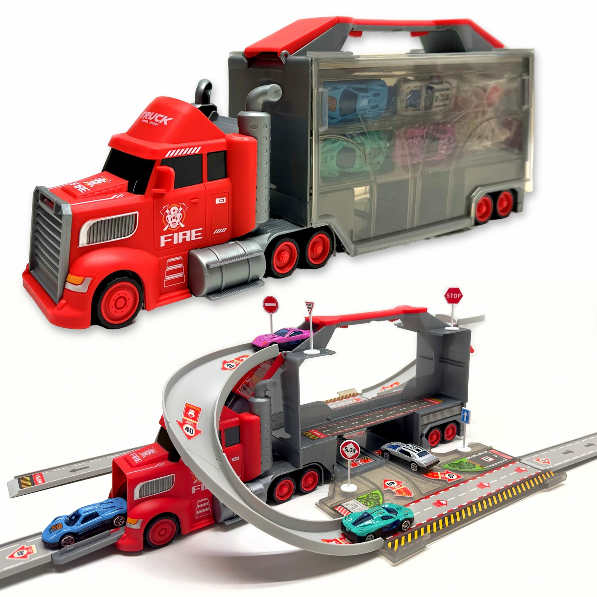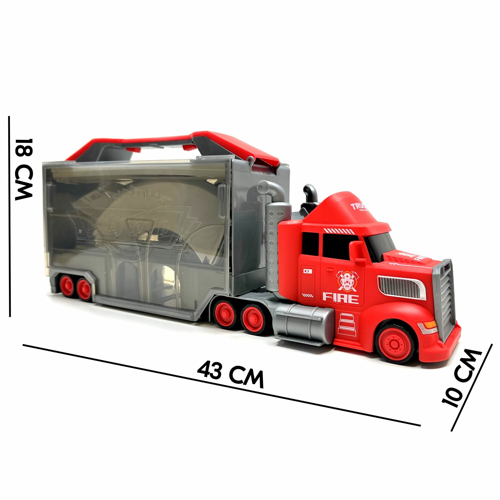 Трейлер с машинками, автовоз с набором пожарных машинок и вертолетом, кейс с ручкой, 40х12х9 см