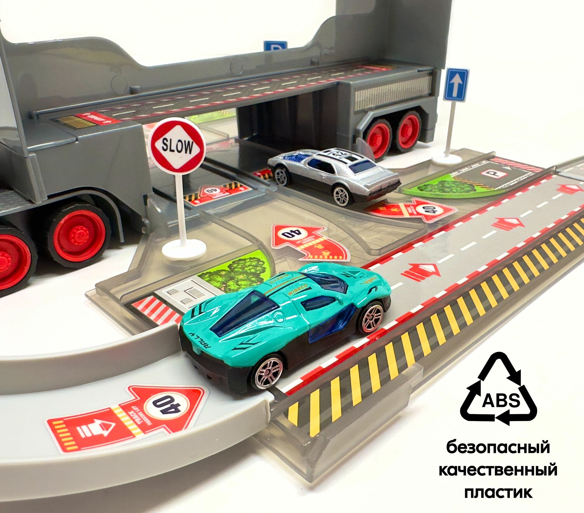 Трейлер-гараж с набором машинок и дорожных знаков, машина-автовоз (кейс с ручкой) 678-4, 40х12х9 см