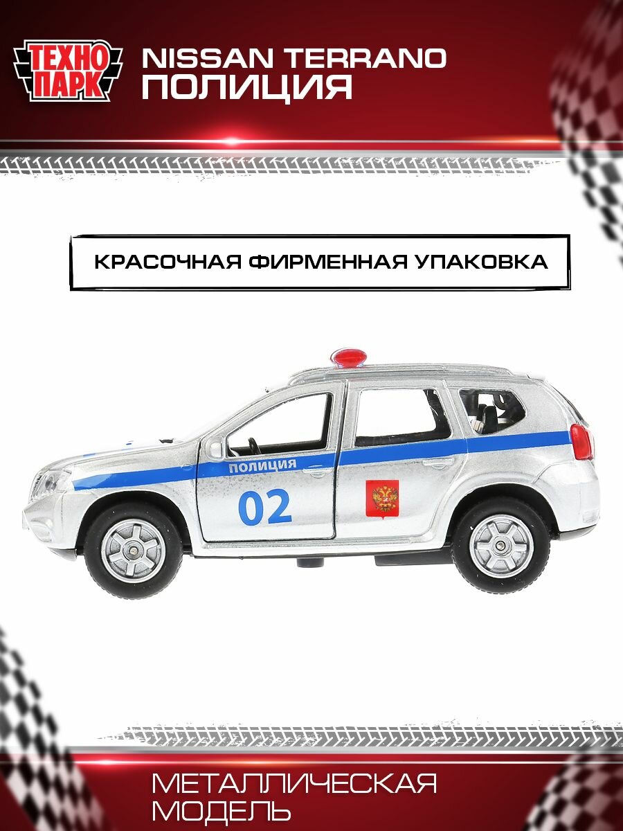 Машинка детская Nissan Terrano Полиция 12 см, Технопарк, серебристая, металлический корпус, открываются двери и багажник