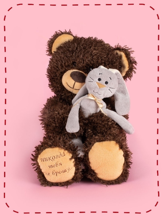 | Дополнительная информация | Чиба держит в руках зайца, а на лапке у него написано: "Никогда тебя не брошу"; материал: мех искусственный, софт-велюр, трикотаж; ширина игрушки- 16 см, длина - 22 см; упаковка - пакет |