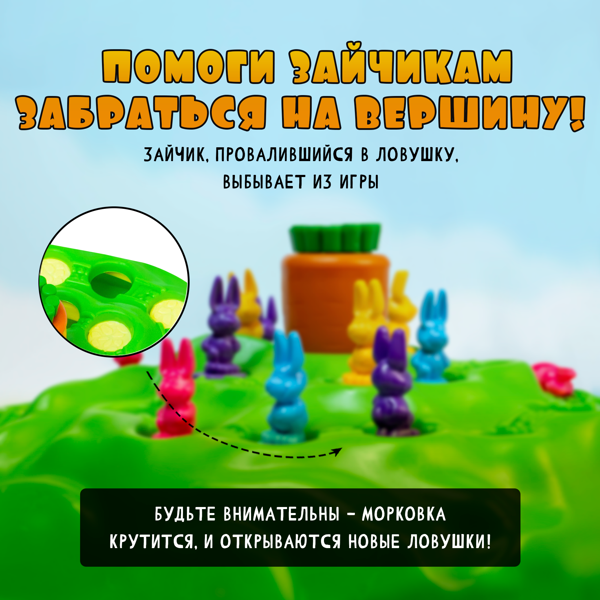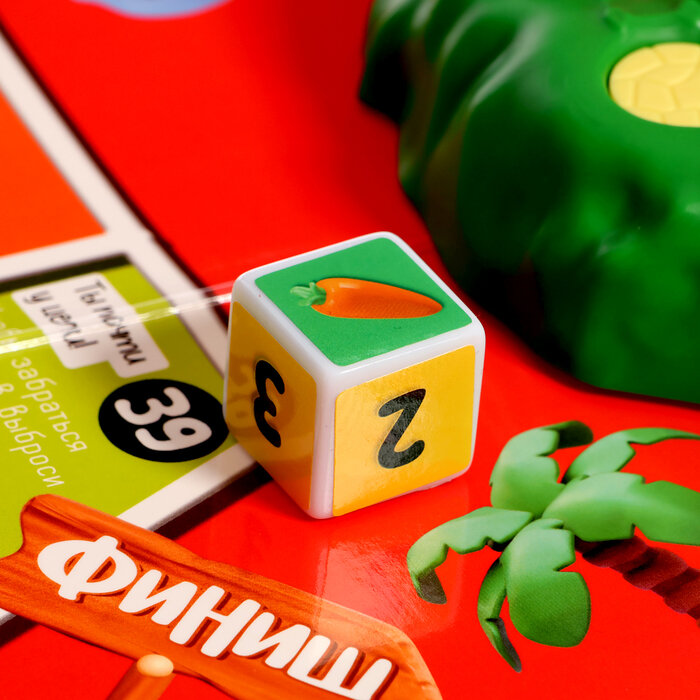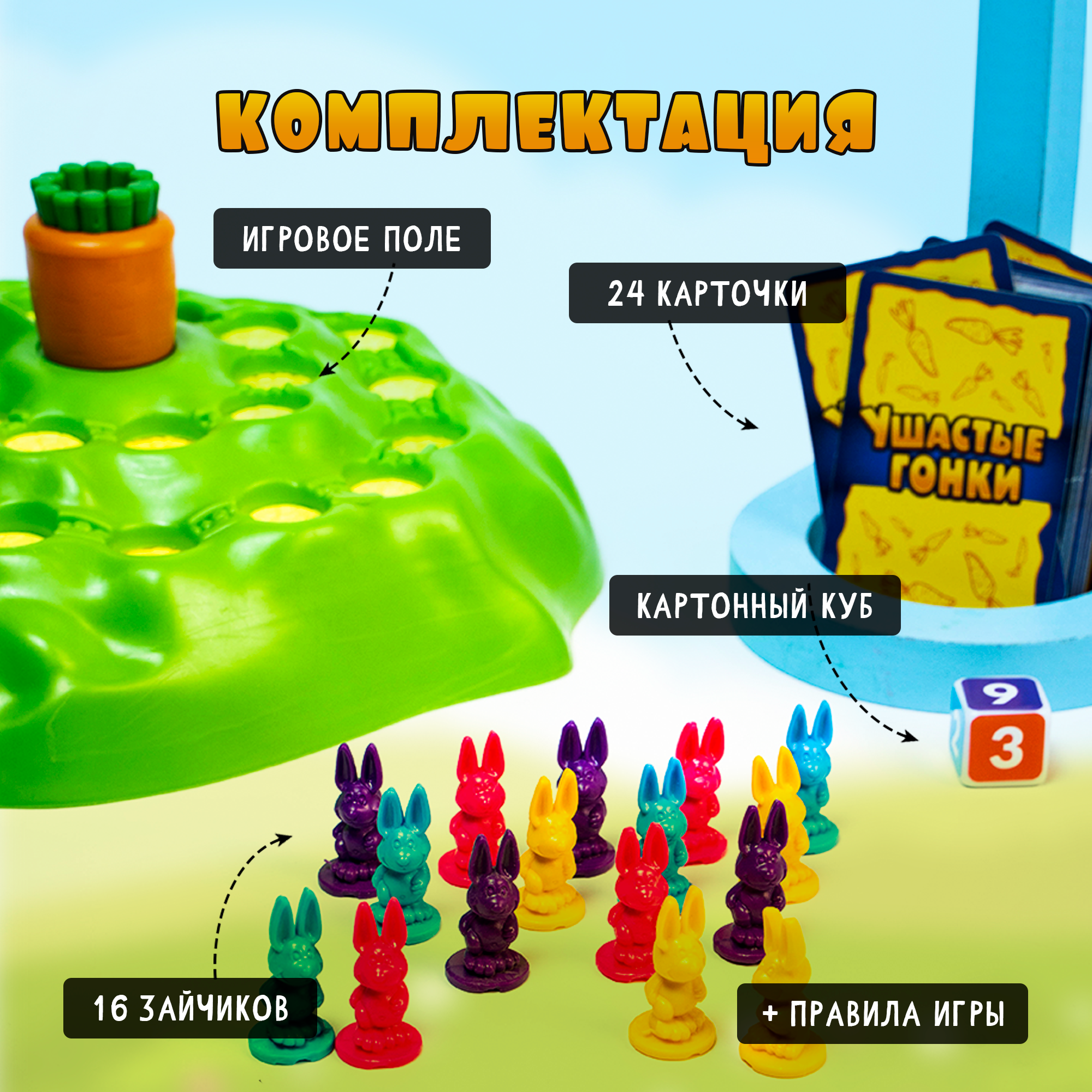 | Комплектация | игровое поле, 24 карточки, 16 фигурок зайчиков, картонный кубик, правила игры |
