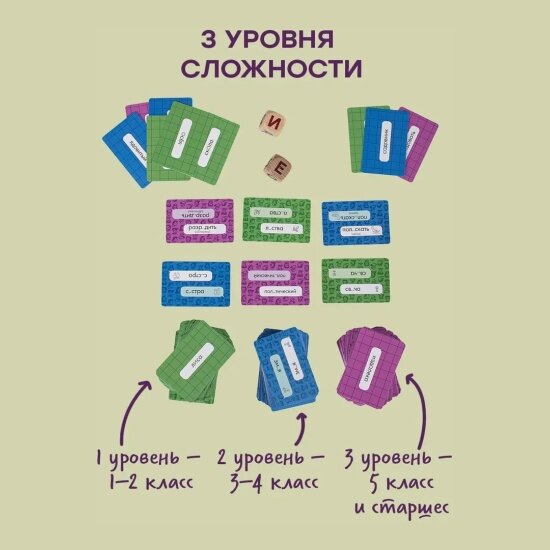 | Комплектация | 60 карт 1 уровня, 60 карт 2 уровня, 60 карт третьего уровня, 2 кубика с буквами, правила игры |