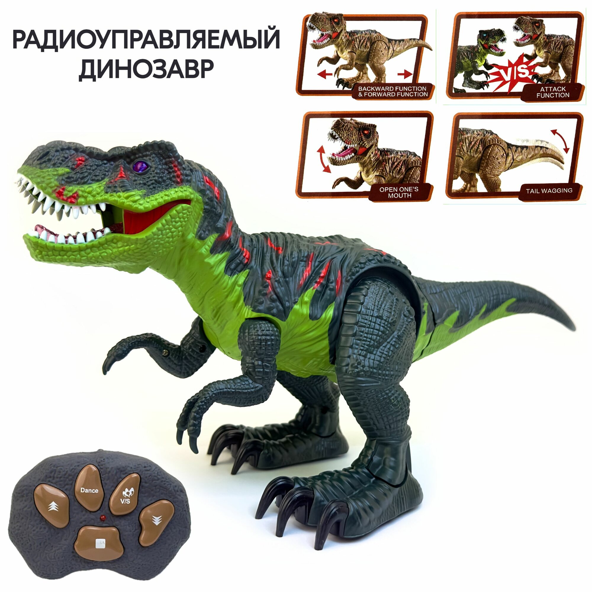 Купить Радиоуправляемый робот динозавр Тираннозавр, глаза светятся, ходит, рычит, танцует, тирекс на пульте управления, 38х19х16 см