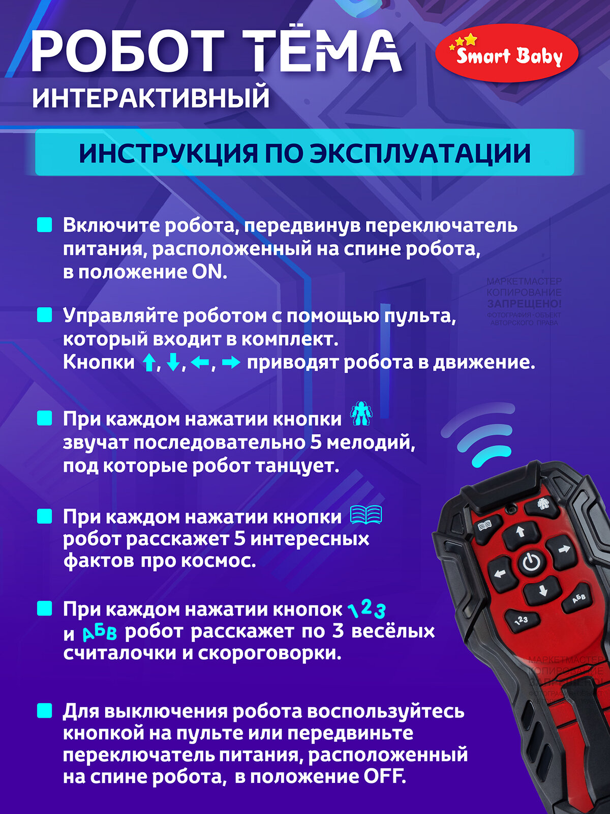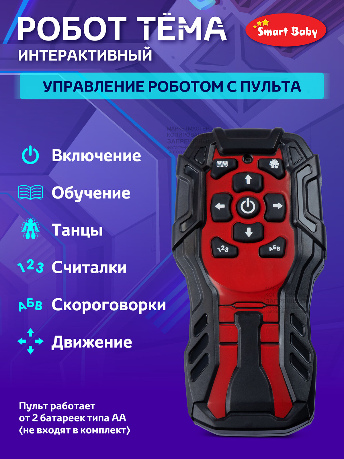 | Дополнительная информация | робот может: изменять направление движения, говорить приветственную фразу, танцевать под музыку (5 мелодий), рассказывать 3 скороговорки, рассказывать 3 считалочки, рассказывать 5 фактов о космосе; тип питания пульта управления: батарейки |