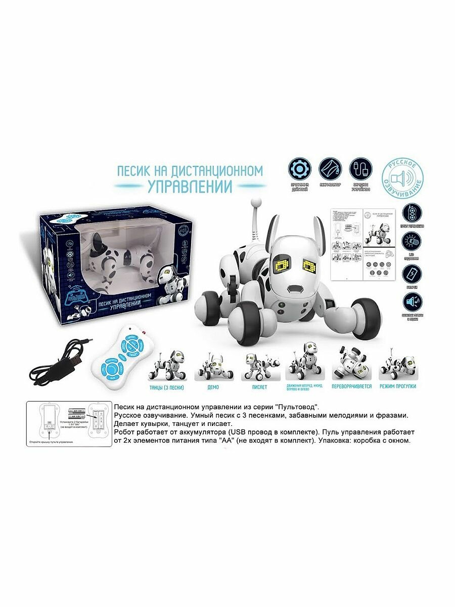 | Дополнительная информация | общается на русском языке, поет песни, танцует; анимированные глаза передают эмоции; датчики для обхода препятствий и распознавания команд; общее количество команд - 10; время зарядки: около 60 минут; время игры: около 30-40 минут; элементы питания в пульт управления: 2xАА (в комплект не входят); дальность действия: около 10 метров |
