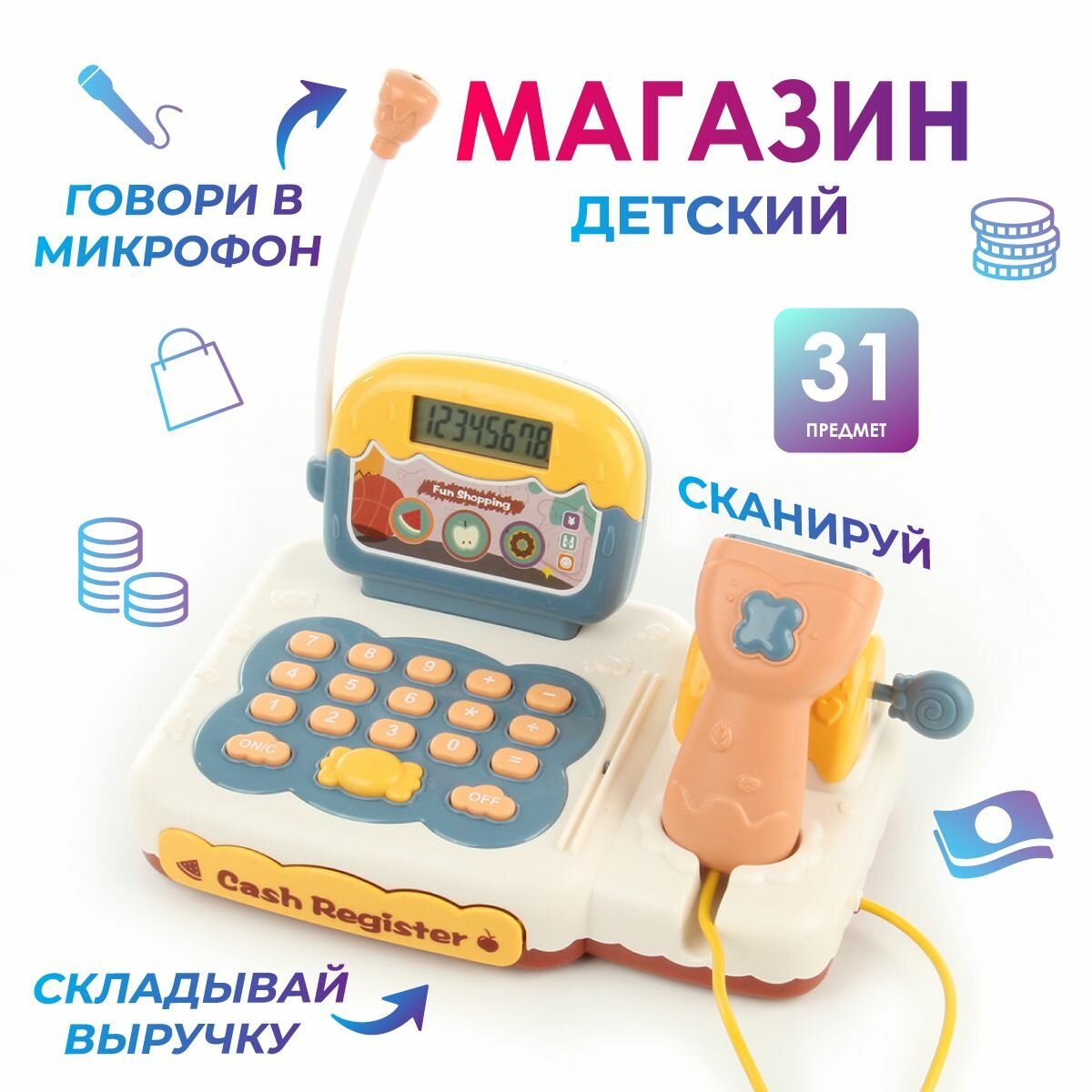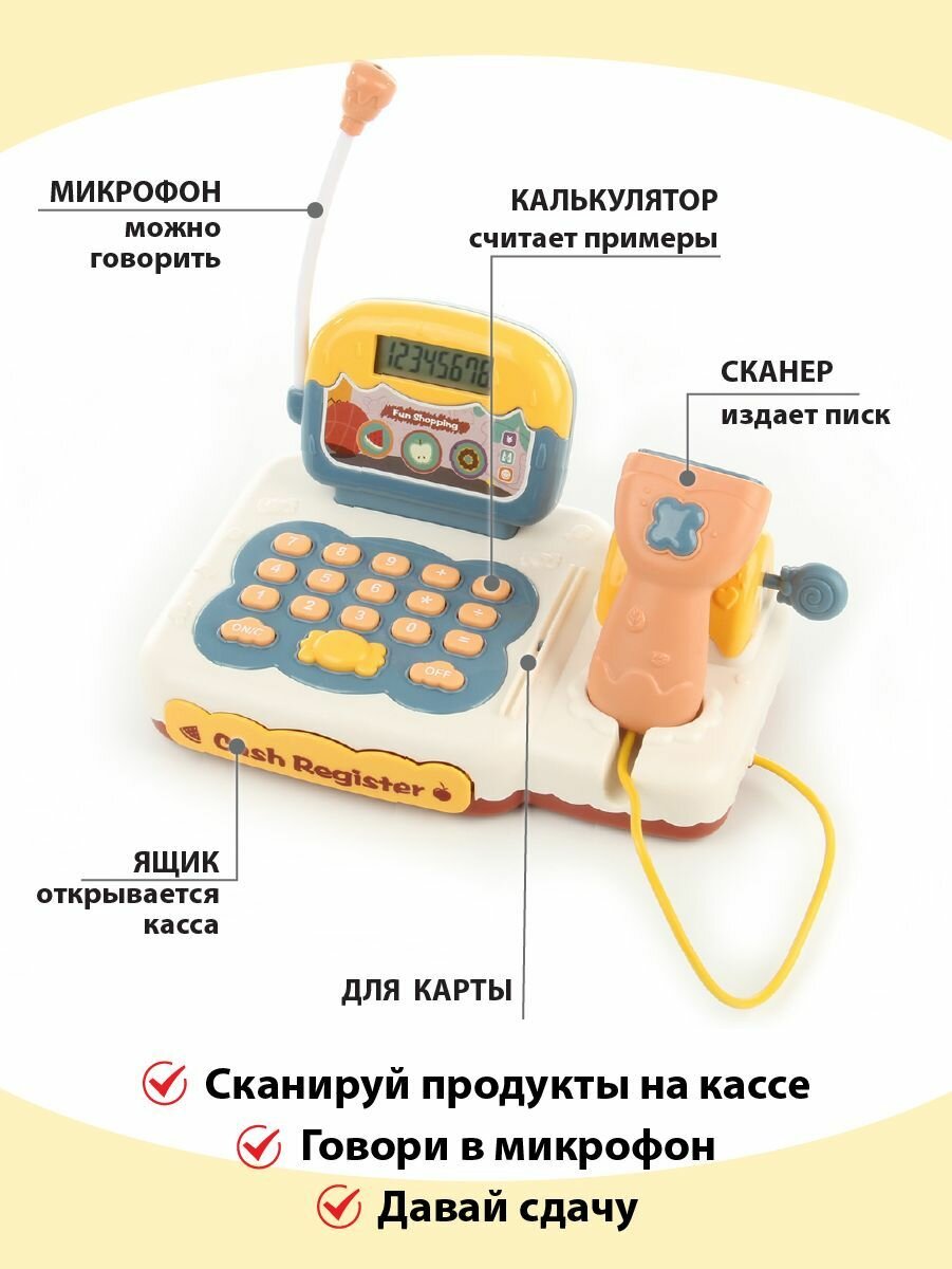 Детский игровой набор касса со сканером, Veld Co / Игрушечный кассовый аппарат со светом и звуком / Корзина с продуктами для детей интересное: