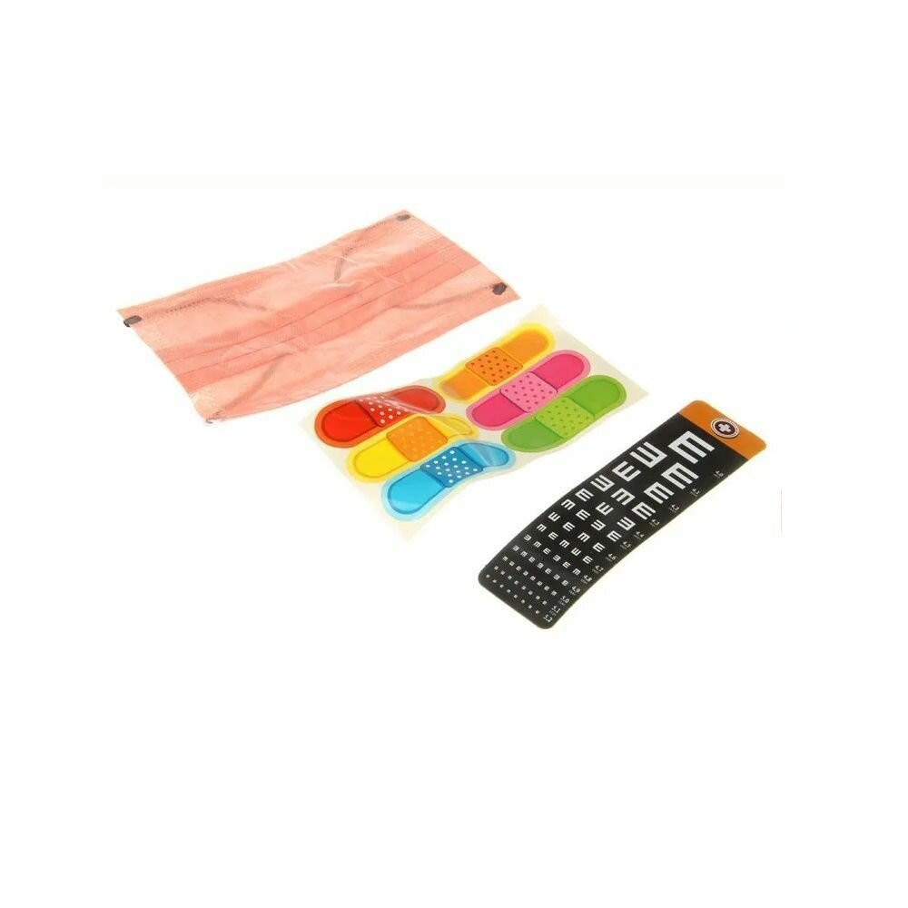 | Комплектация | -чемодан 26 х 17 х 17 см; - халат 38 х 64 см (длина рукава 37 см); -медицинская шапочка 17 х 17 х 9 см; - шприц 14.5 см; - зубная щетка 14 см; - молоточек 12 см; - фонарик 9 см; - стетоскоп 53 см; -2 макета зубиков 5 х 3 х 7 см; - очки 11,5 ( дужка 10,5), -кружка 8 х 6 х 5 см; - капельница 23 см; - лобный рефлектор окулиста 57 см; - планшет с игрушечной ручкой 11.3 х 12.3 х 2 см; - маска для лица 17 х 9 см; - лоток 10 х 5 х 1,5 см; - отоскоп; -стоматологический зонд; -стоматологическое зеркало; - щипцы; - зубная паста; - градусник; -2 таблетки; -2 капсулы; - лейкопластырь; - нож; - скальпель; - ножницы; - аппарат для давления; - таблица для проверки зрения; - мензурка; - бормашина; - витамин В12, аспирин и игрушечные капли; - бейджик, карта и карта пациента. |