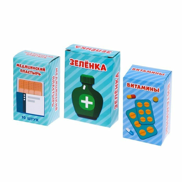 | Комплектация | чемоданчик доктора, полупрозрачный, с ручкой для переноски, пустые коробочки с рисунком зелёнки, витаминов и медицинского пластыря, стетоскоп, судок для инструментов, кислородная маска, рентген, смотровая лампа, пинцет, ножницы, карта пациента, неврологический молоток, шприц |