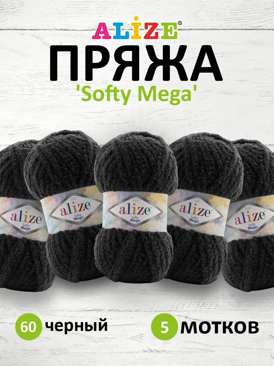 Пряжа Softy mega, Alize, черный - 60, 100% микрополиэстер, 5 мотков, 100 г., 70 м.