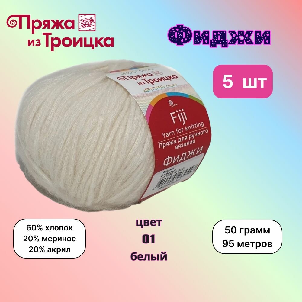 Троицкая пряжа для вязания Фиджи Белый (01) 5 мотков 50 г/95 м (60% хлопок, 20% мериносовая шерсть, 20% акрил) fiji интересное: