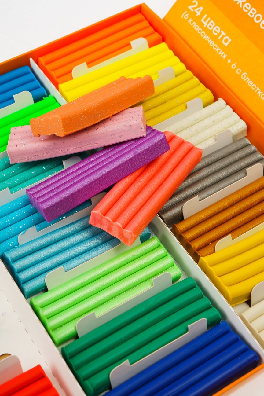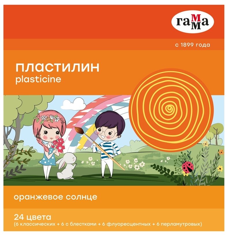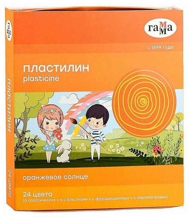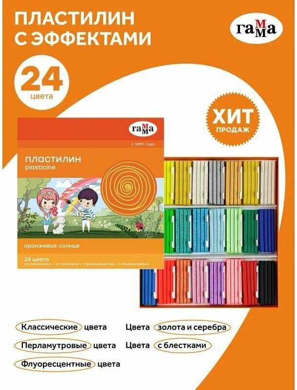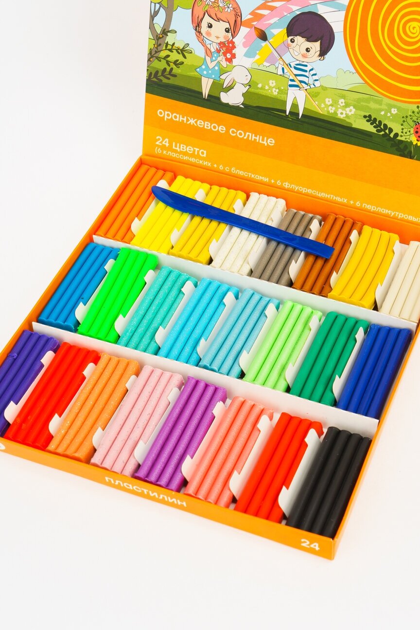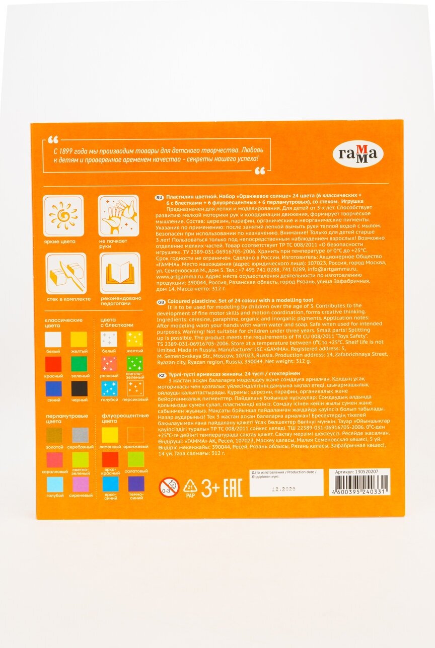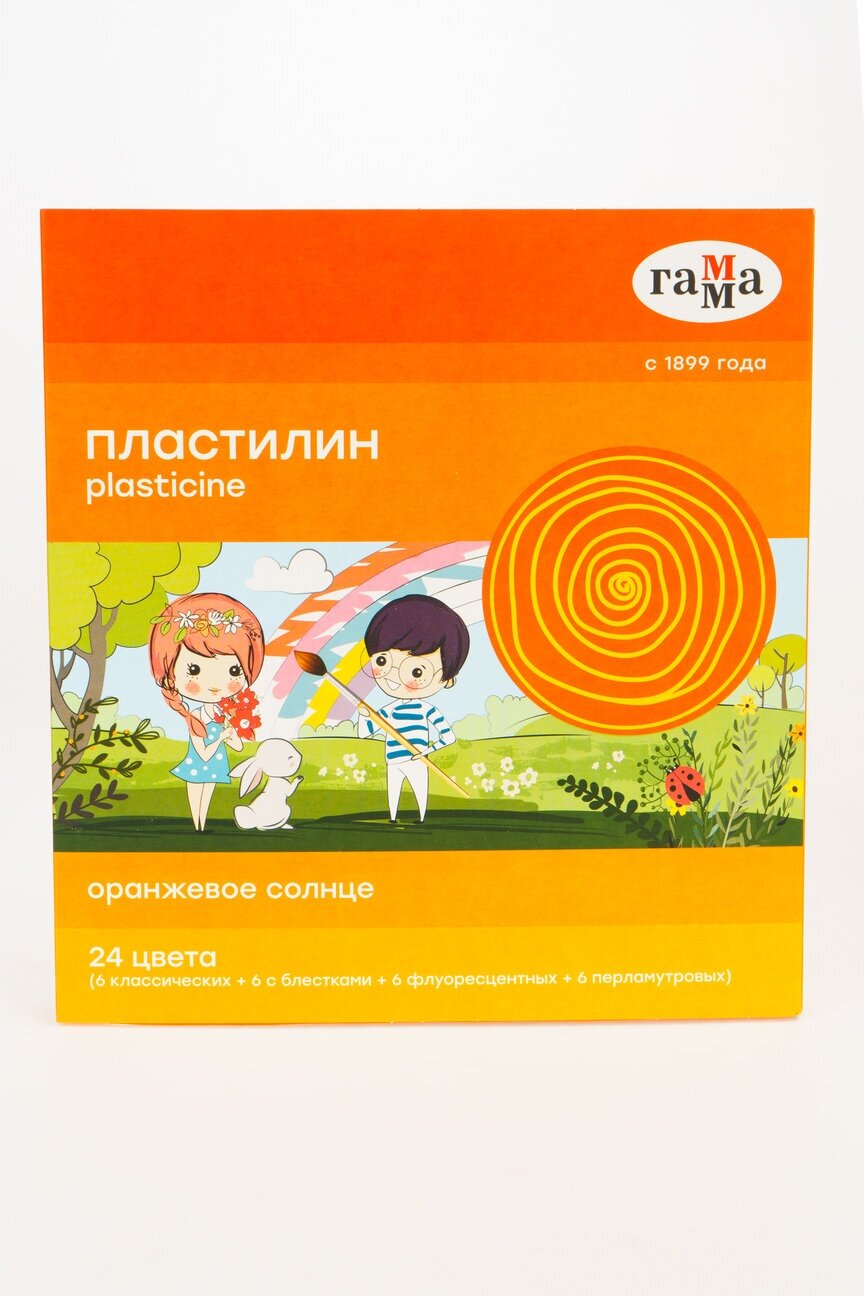 Пластилин Гамма "Оранжевое солнце", 24 цвета (6 шт. с блёстками + 6 шт. перламутровые + 6 шт. флуоресцентные + 6 шт. классические), для школы для детей, в комплекте со стеком, в картонной упаковке